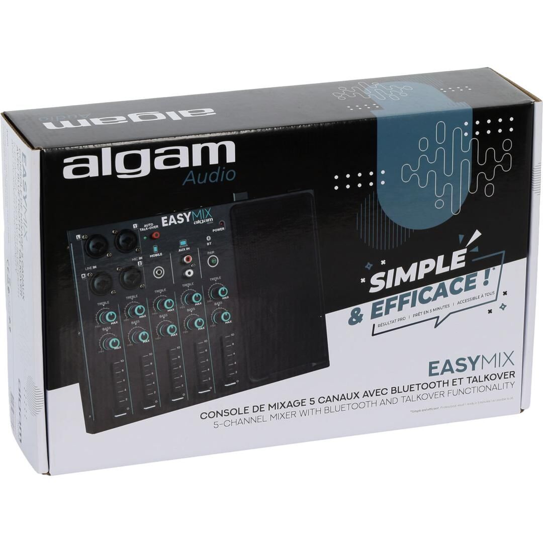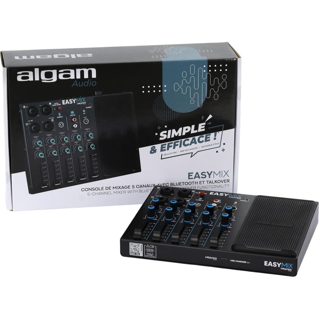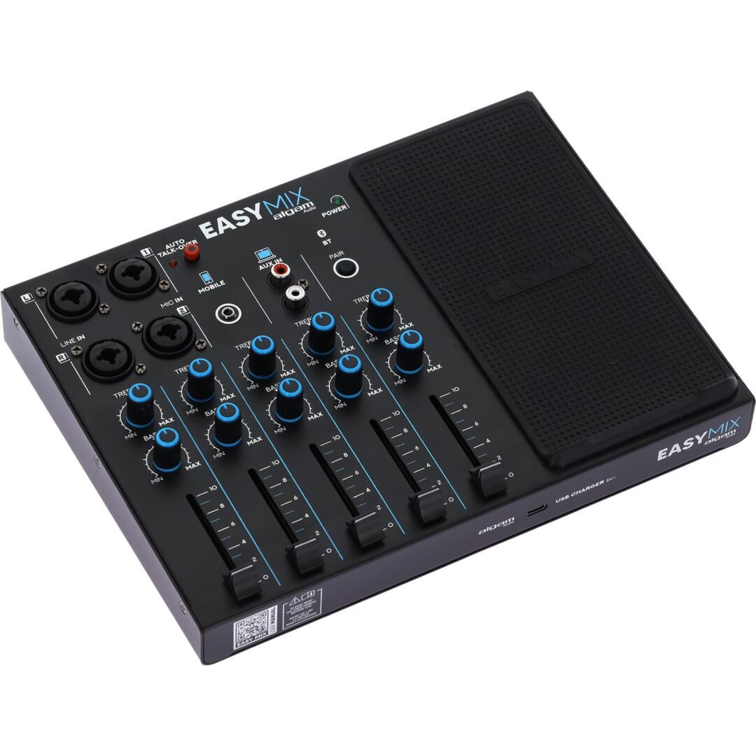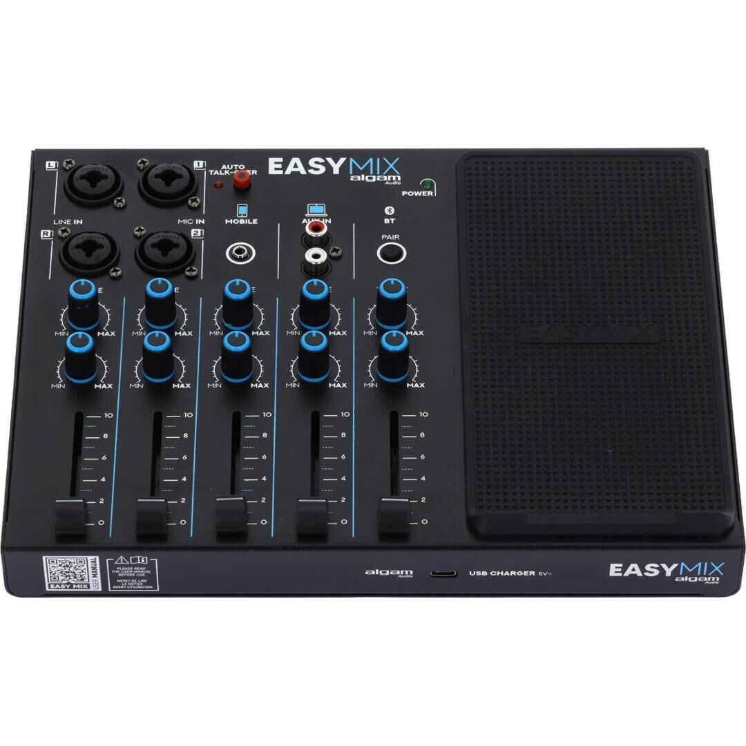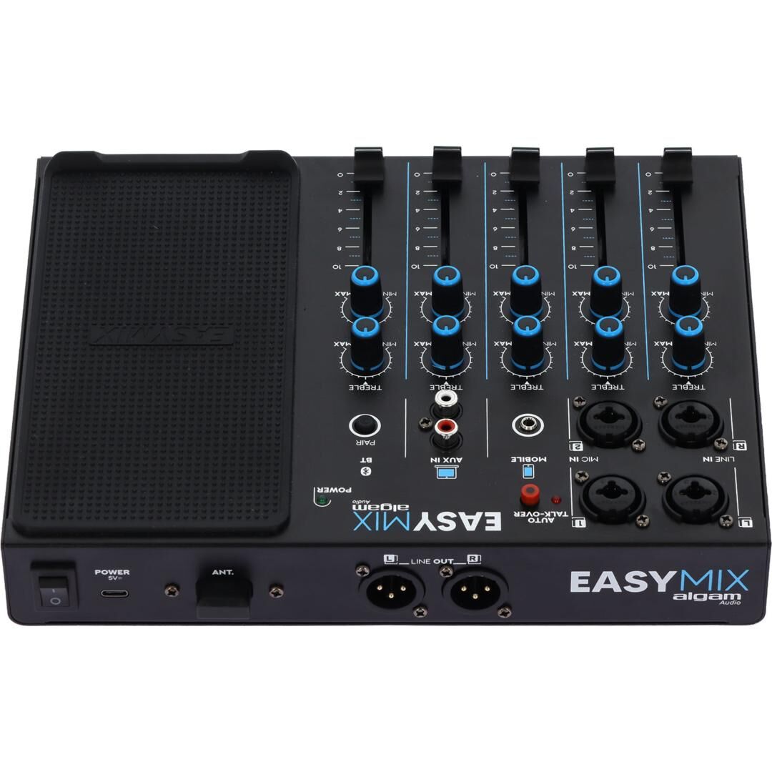 Keine komplizierten und einschüchternden Mischpulte mehr! Algam Audio präsentiert die Easymix – eine kompakte und unglaublich benutzerfreundliche Konsole mit einer klar strukturierten und einfachen Oberfläche. Sie ist nahezu sofort einsatzbereit: Einfach Instrumente und Mikrofone anschließen, Audioquellen wie Smartphone oder Laptop verbinden, den Klang mit den Bass- und Höhenreglern anpassen und die Lautstärke jeder Quelle mit den einzelnen Fadern regulieren.