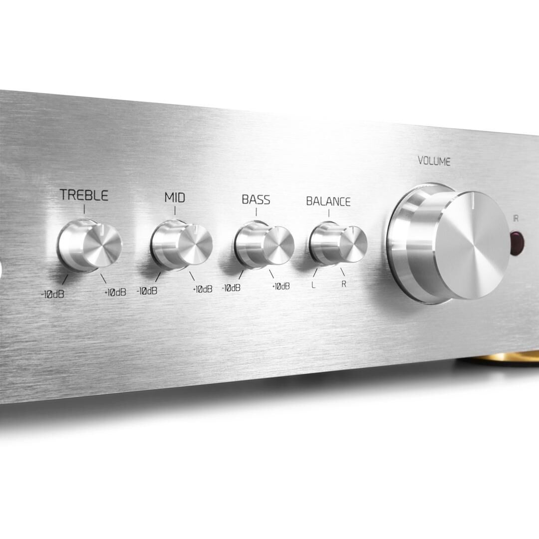 - Intuitive Bedienelemente: Treble, Mid, Bass, Lautstärke, Source‑Selector