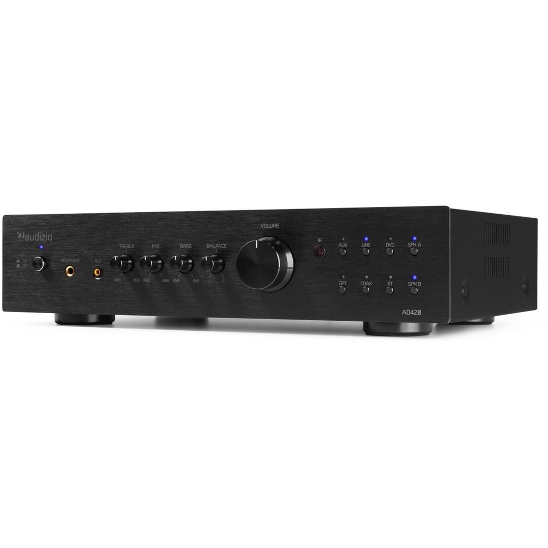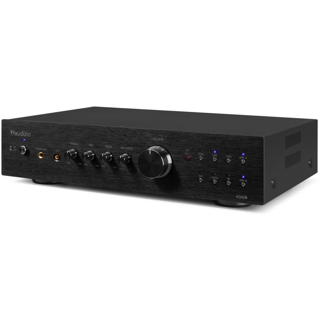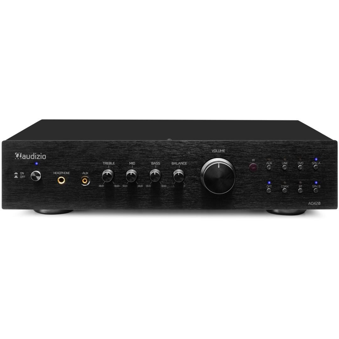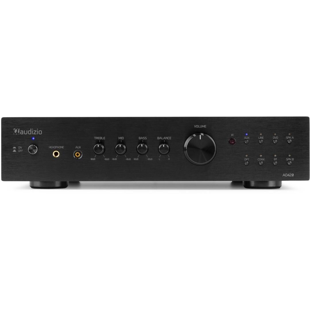 In Bezug auf die Konnektivität ist der AD420B sehr flexibel. Neben den drei RCA‑Line‑Eingängen verfügt er über einen 3,5‑mm‑AUX‑Jack, optische und koaxiale Anschlüsse sowie einen Bluetooth‑5.0‑Receiver. Damit können Sie problemlos Smartphones, Tablets oder Laptops verbinden und Musik drahtlos streamen. Zusätzlich gibt es einen Kopfhörerausgang an der Vorderseite für private Hörsessions.