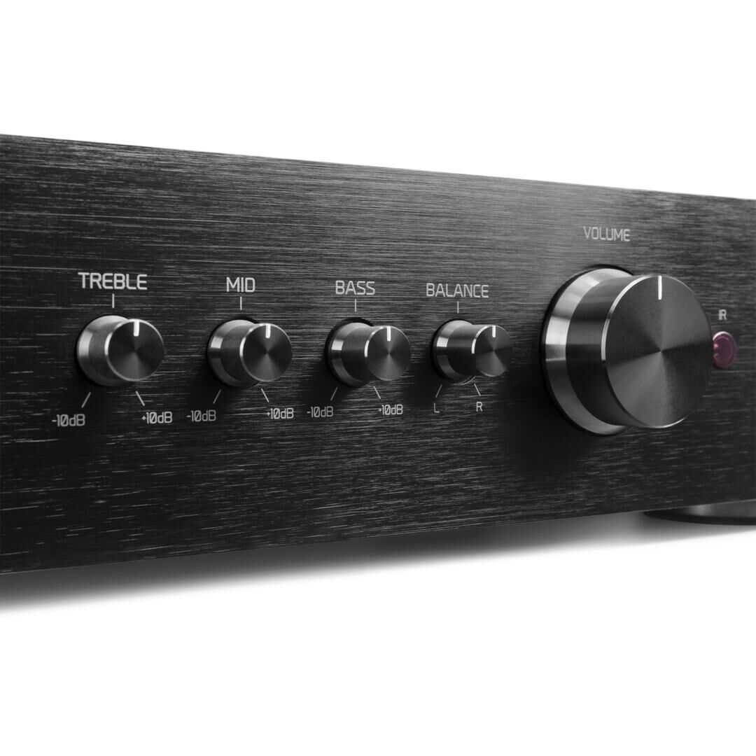 Das Design des Verstärkers ist robust und elegant. Der Frontbereich aus gebürstetem Edelstahl wirkt hochwertig, während die goldgelackten Lautsprechertreiberterminals eine sichere Verbindung gewährleisten. Für zusätzlichen Komfort ist ein Fernbedienung mit Eingangsmodus‑Auswahl, Bass‑/Mitten‑/Hochton‑Regler und Lautstärkeregelung im Lieferumfang enthalten.
