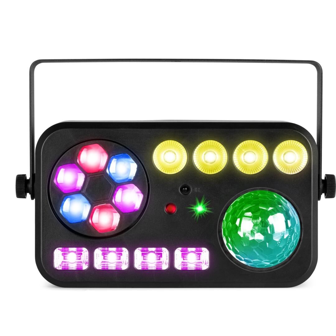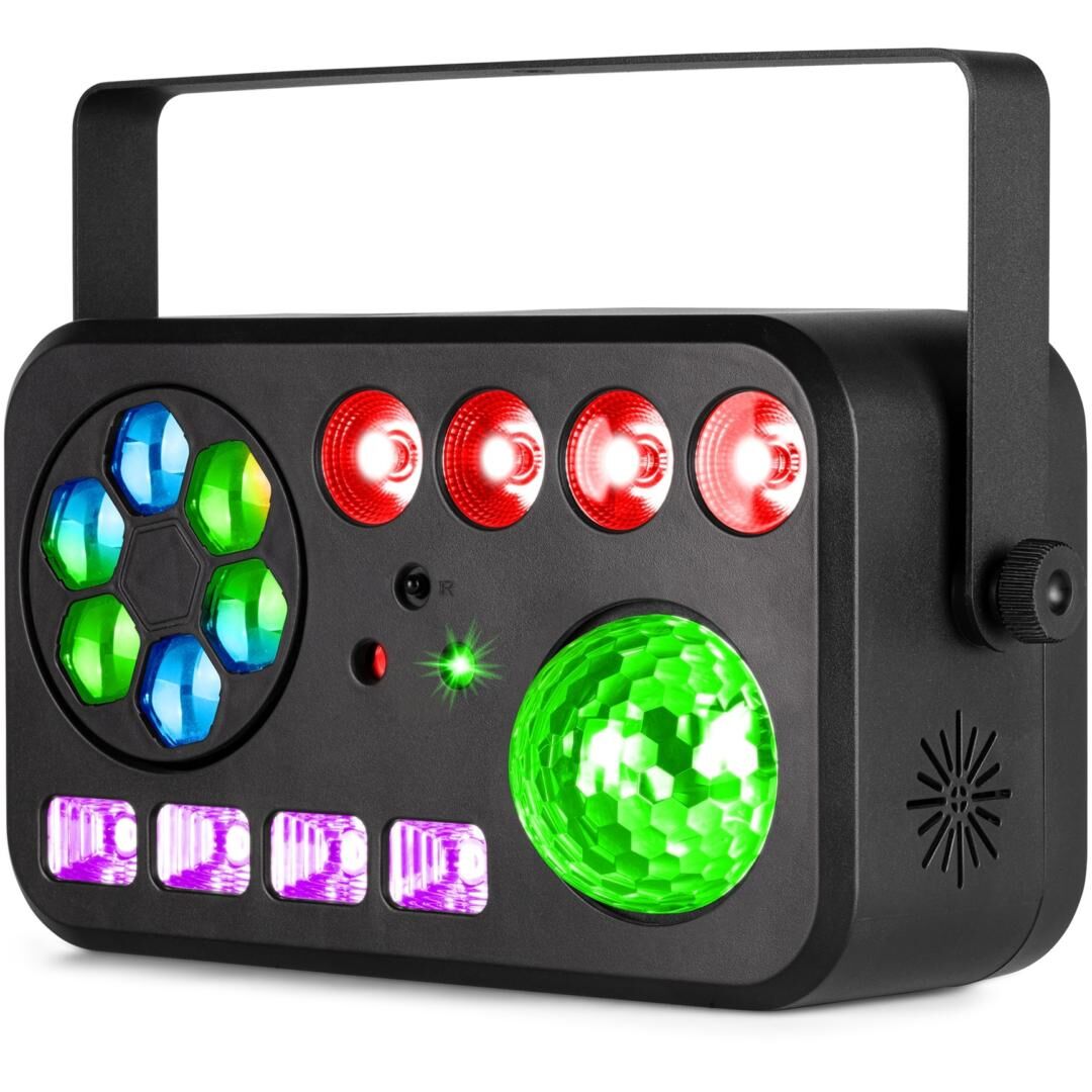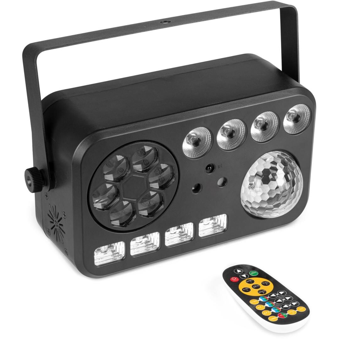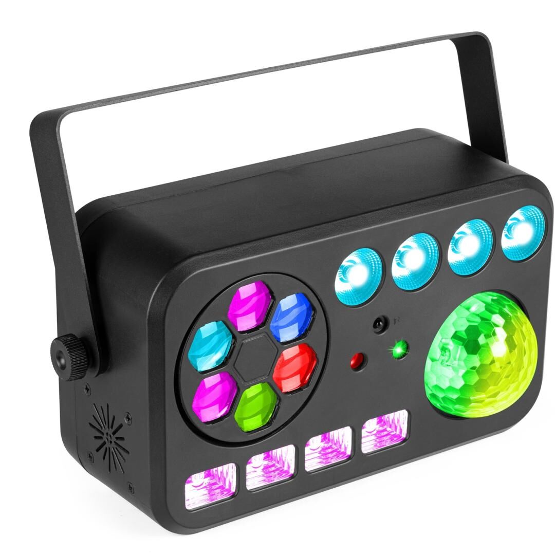 - 6‑in‑1 Lichteffekt: Bee Eye, Jelly Ball, PAR‑Wash, UV, Strobe und doppelter Pattern‑Effekt (Rot/Grün)
