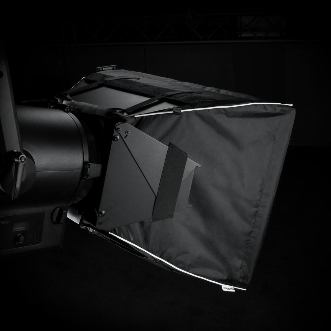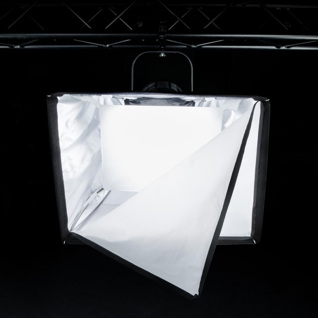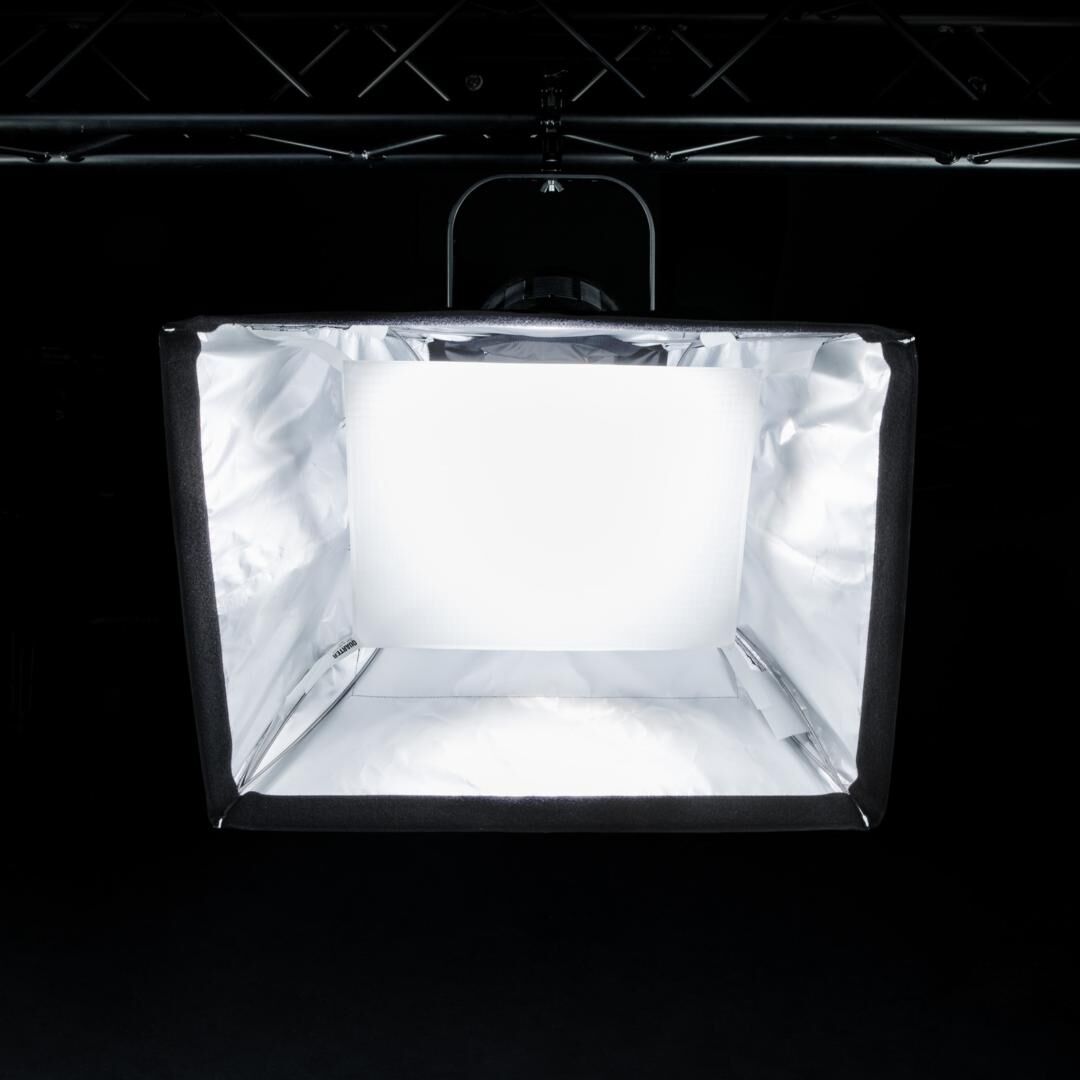 Die Konstruktion kombiniert ein robustes, wetterbeständiges Obermaterial mit formstabilen Metallverstrebungen. Dadurch sitzt die Softbox sicher, bleibt in Form und ist für den Touring-Alltag ebenso geeignet wie für Festinstallationen. Die stark reflektierenden Innenflächen steigern die Effizienz des Scheinwerfers und sorgen für eine gleichmäßige Ausleuchtung ohne Hotspots – ein Vorteil bei Nahaufnahmen und Hauttönen.