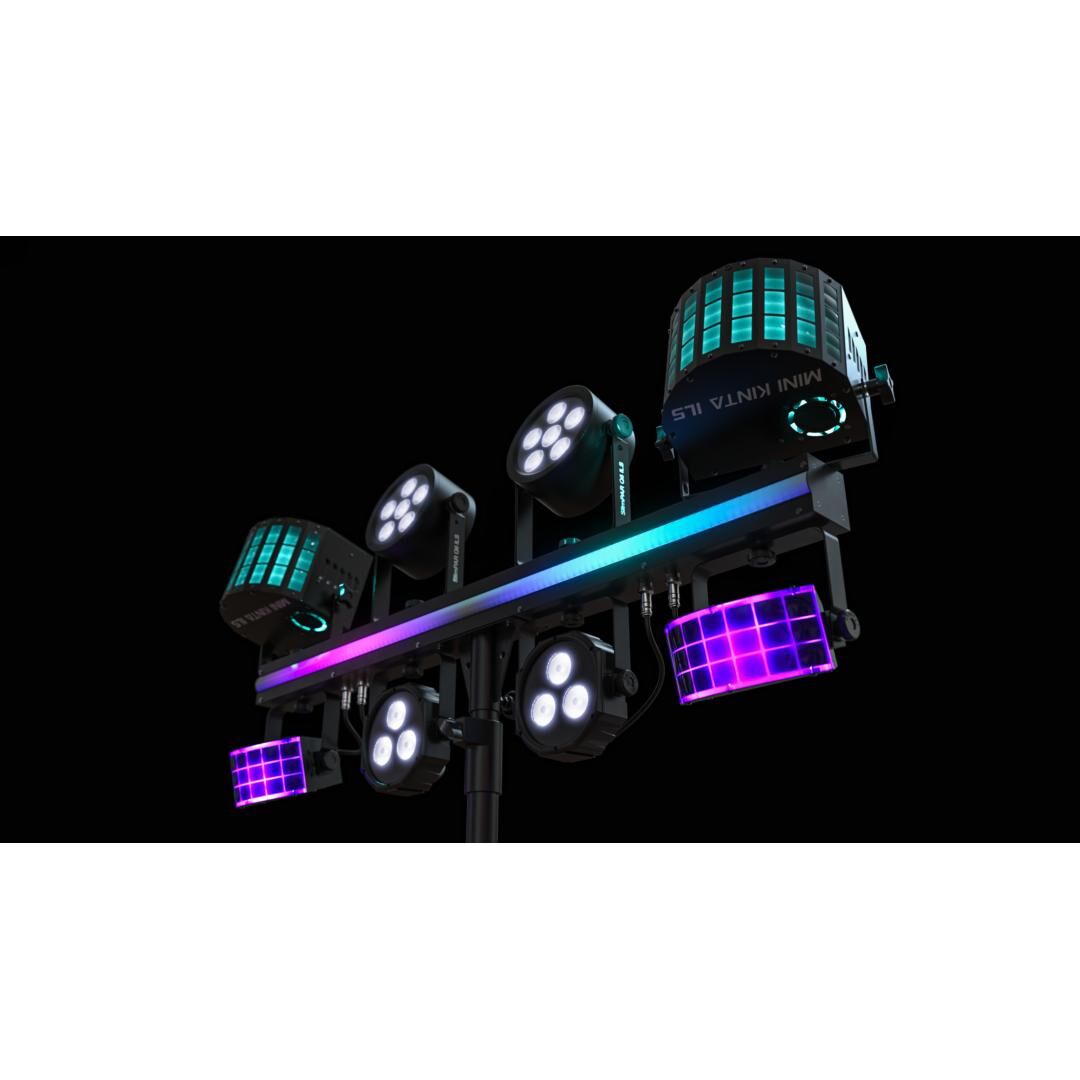 Die LED-Pars (RGB+UV) liefern kräftige Farbwashes mit Schwarzlicht-Anteilen, während die LED-Derbys mehrfarbige, jagende Beams über die Tanzfläche schicken. Die vollflächige LED-Stripe setzt wirkungsvolle Eye-Candy-Akzente und sorgt dank breitem Abstrahlwinkel für Fülllicht und visuelle Dynamik. Mit einer LED-Lebensdauer von bis zu 50.000 Stunden arbeitet das System zuverlässig und wartungsarm.