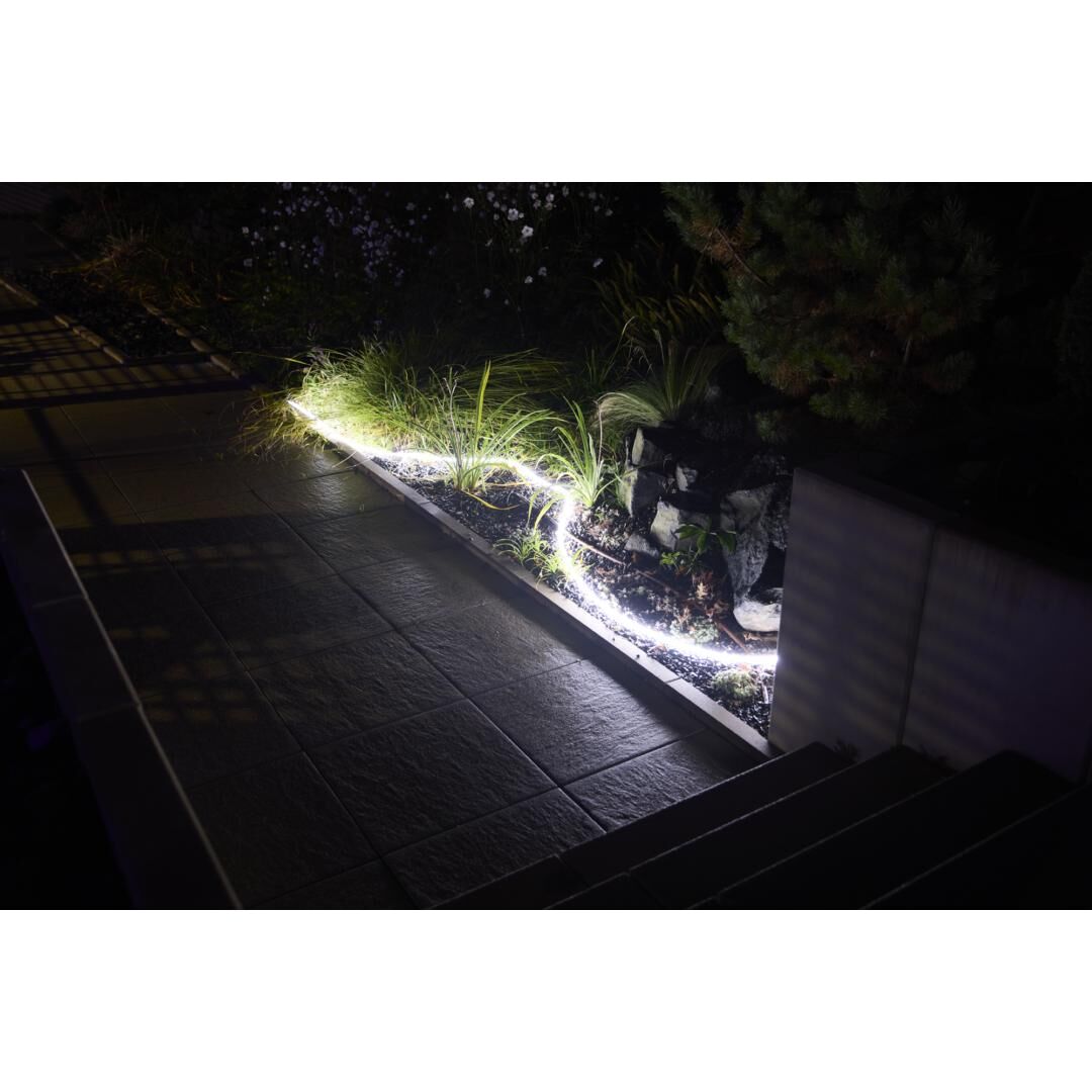 Der nur 15 mm schlanke Silikonmantel macht den LED FLEX Light robust, flexibel und langlebig. Dank IP65 ist der Lichtschlauch staubdicht und gegen Strahlwasser geschützt, wodurch er sich zuverlässig für den Außeneinsatz eignet – selbst bei wechselhaften Witterungsbedingungen.