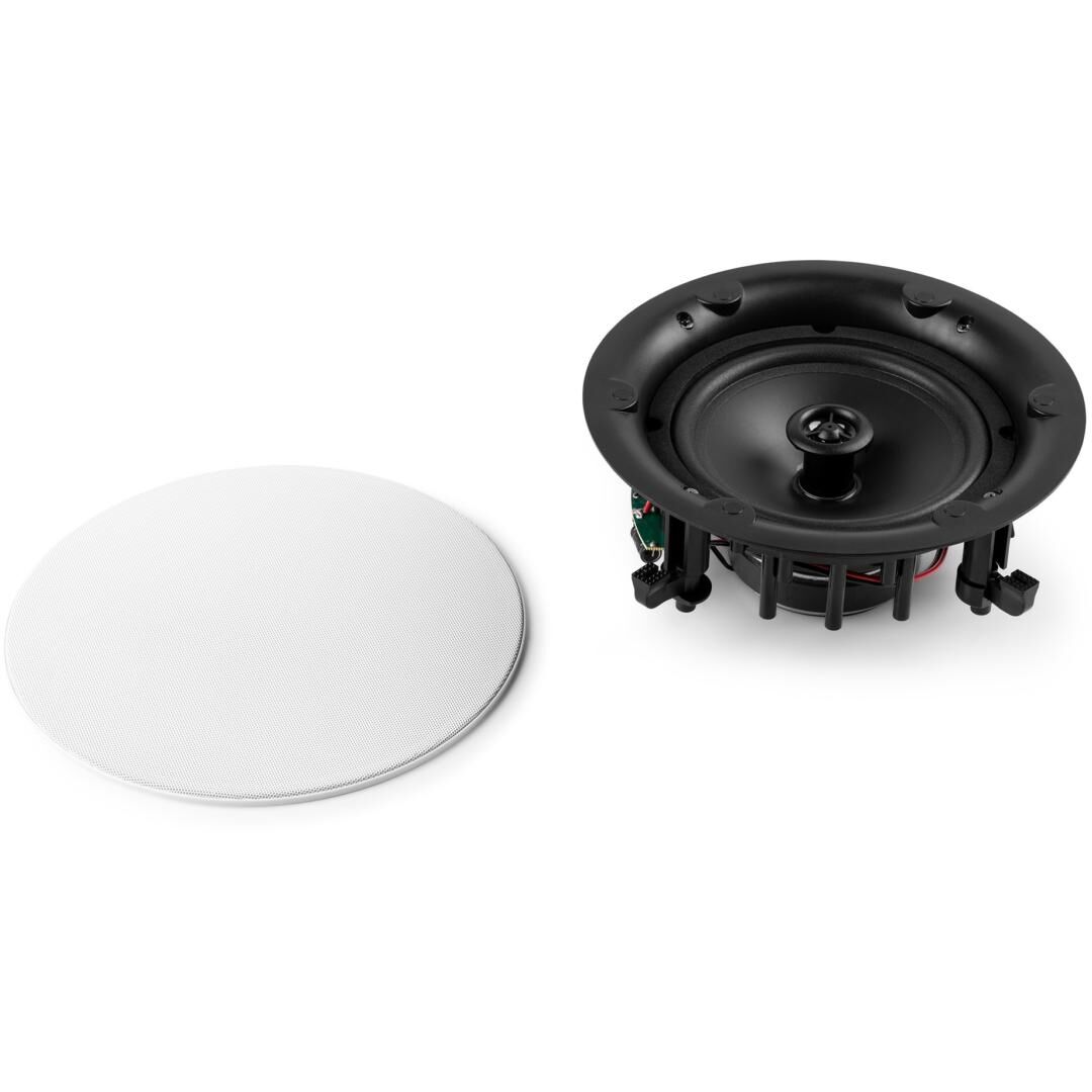 Der eingebaute Class‑D-Verstärker liefert pro Kanal bis zu 25 W RMS an 4 Ohm (20 W an 8 Ohm) und treibt damit die vier mitgelieferten, passiven 2‑Wege-Deckenlautsprecher souverän an. Die Lautsprecher sind mit einem hochwertigen Frequenzweichen-Filter ausgestattet und überzeugen mit einem ausgewogenen HiFi‑Klangbild über den gesamten Bereich von 20 Hz bis 20 kHz. Dank der flachen Bauform und der weiß lackierten, magnetisch haftenden Metallgitter integrieren sie sich unauffällig in Deckenflächen – ideal für eine gleichmäßige Beschallung in ein oder zwei Zonen.