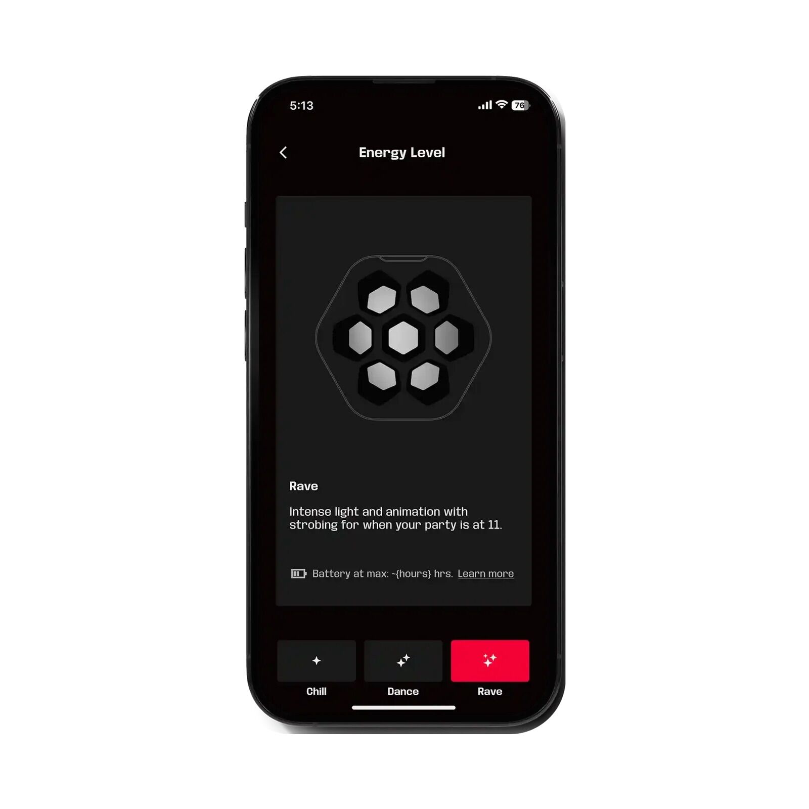 - Akkulaufzeit: 13+ Stunden bei maximaler Helligkeit und Energiestufe 3 (Rave), 10+ Stunden bei 60 % Helligkeit und Energiestufe 2 (Dance)