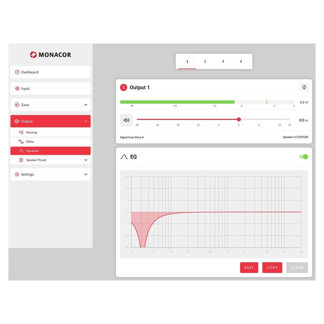 - Umfangreicher DSP: HP/LP-Filter, 5-Band-Parametrik (Eingang), FIR-Filter (Ausgang)