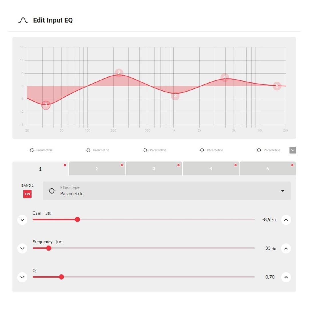 - Umfangreicher DSP: HP/LP-Filter, 5-Band-Parametrik (Eingang), FIR-Filter (Ausgang)