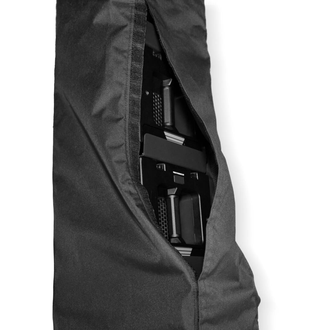 Auch an die Elektronik wurde gedacht: Das Klarsichtfenster ist so ausgeführt, dass die Amp-Einheit ausreichend belüftet bleibt. So wird die Bedienbarkeit bei wechselhaftem Wetter mit der notwendigen Luftzirkulation kombiniert. Das modulare Klettsystem erleichtert die Montage, erlaubt flexible Anpassungen an das Setup (geflogen oder im Groundstack) und spart Zeit beim Auf- und Abbau – ein echter Vorteil im Live-Betrieb.