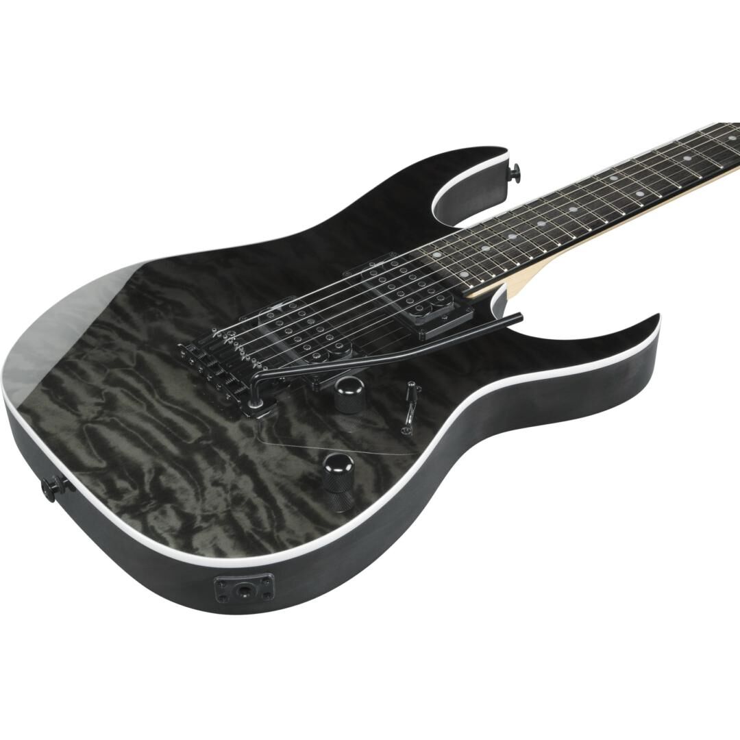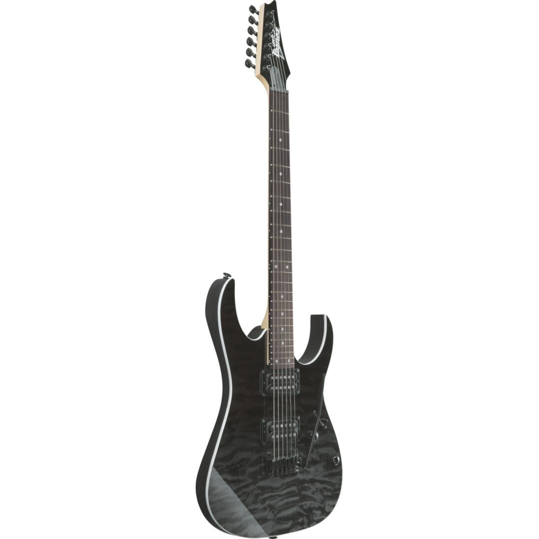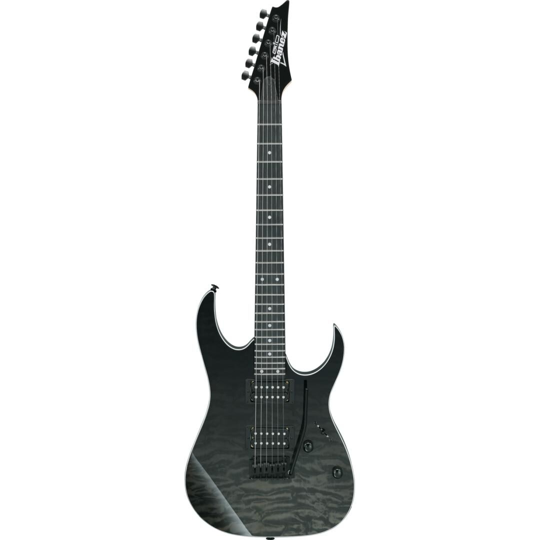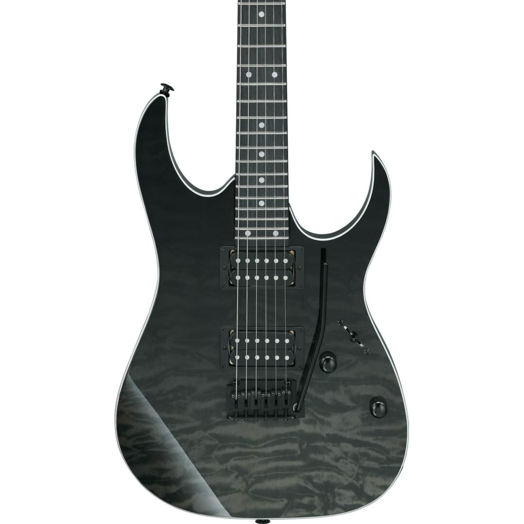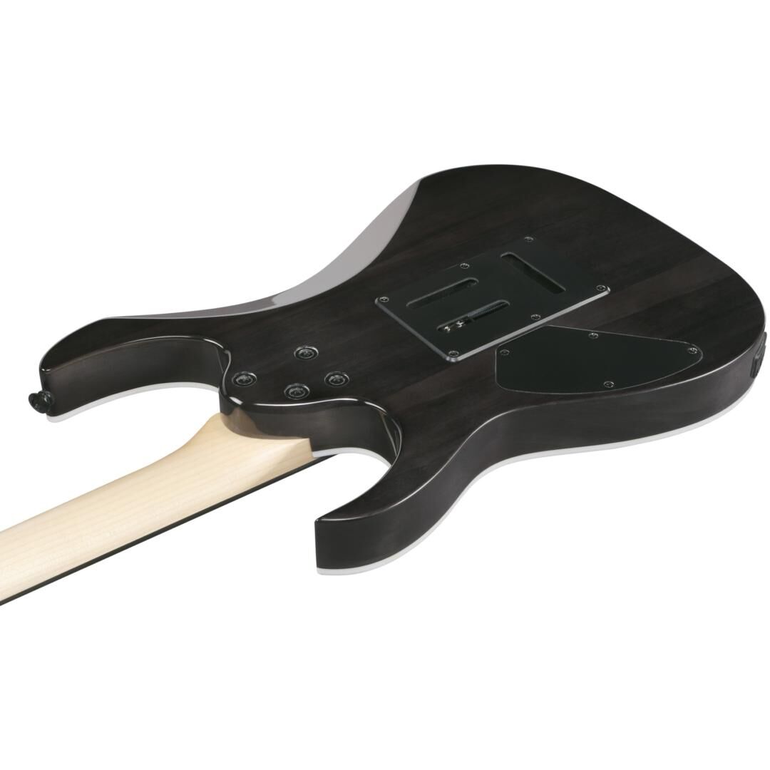 Beim Korpus setzt Ibanez auf Pappel für ein ausgewogenes, durchsetzungsfähiges Klangfundament. Die Decke in Wölkchenahorn-Optik (Quilted Maple Art Grain auf Linde) verleiht der Gitarre einen hochwertigen Look, der in Kombination mit dem Gloss Polyurethane Finish und der Black-Hardware die moderne RG-Ästhetik unterstreicht. Die Black Gradation-Lackierung sorgt dabei für einen dezenten Farbverlauf mit hohem Wiedererkennungswert – bühnentauglich und alltagssicher zugleich.