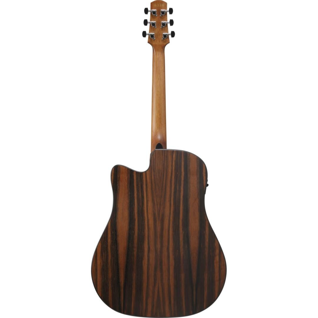 Komfort wird großgeschrieben: Der Low Oval Grip Hals aus Okoume liegt entspannt in der Hand und begünstigt sauberes Akkord- und Lagenspiel. Ein 43-mm-Sattel, das 400-mm-Griffbrettradius sowie die 650-mm-Mensur unterstützen präzise Intonation und eine natürliche Saitenspannung. Der Advanced Access Cutaway schafft zusätzlichen Platz in den hohen Lagen, während die zugespitzte Kopfplatte und die präzisen 18:1 Die-Cast-Mechaniken für stabile Stimmung sorgen. Purpleheart kommt bei Griffbrett und Steg zum Einsatz und trägt zur zuverlässigen Schwingungsübertragung bei; Ibanez Advantage Pins erleichtern den Saitenwechsel.
