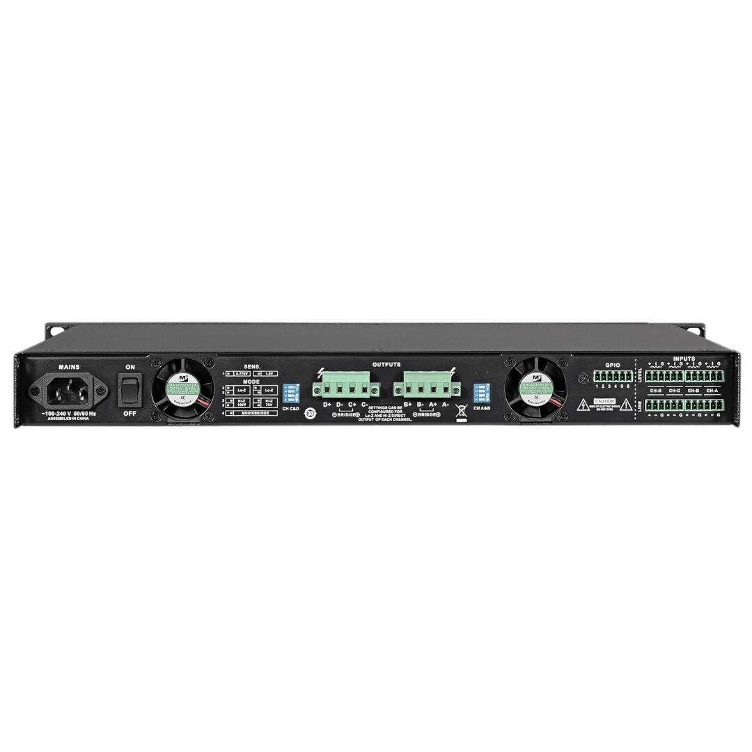Der Verstärker ist mit praktischen Euroblock-Verbindern, GPIO-Steuerung und einem rückseitigen Netzschalter ausgestattet. Ein tamper-proof Frontgitter schützt die Kanalpegelsteuerungen für einen sicheren Einsatz in öffentlichen oder gewerblichen Räumen. Mit wählbarer Eingangsempfindlichkeit (1 V oder 0.775 V) und einem breiten AC-Eingangsbereich bleibt er stabil, selbst bei schwankender Netzspannung.