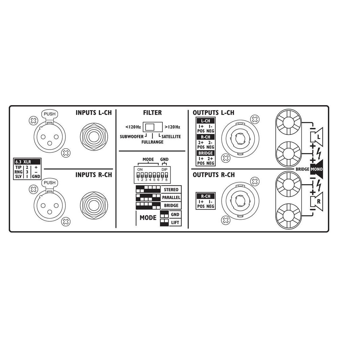 Mit NEUTRIK-SPEAKON-Anschlüssen und verschiedenen Eingangsoptionen ist der Verstärker vielseitig einsetzbar. Die 3 Betriebsarten (Stereo, Parallel oder Brücke) ermöglichen eine flexible Nutzung in verschiedenen Szenarien.