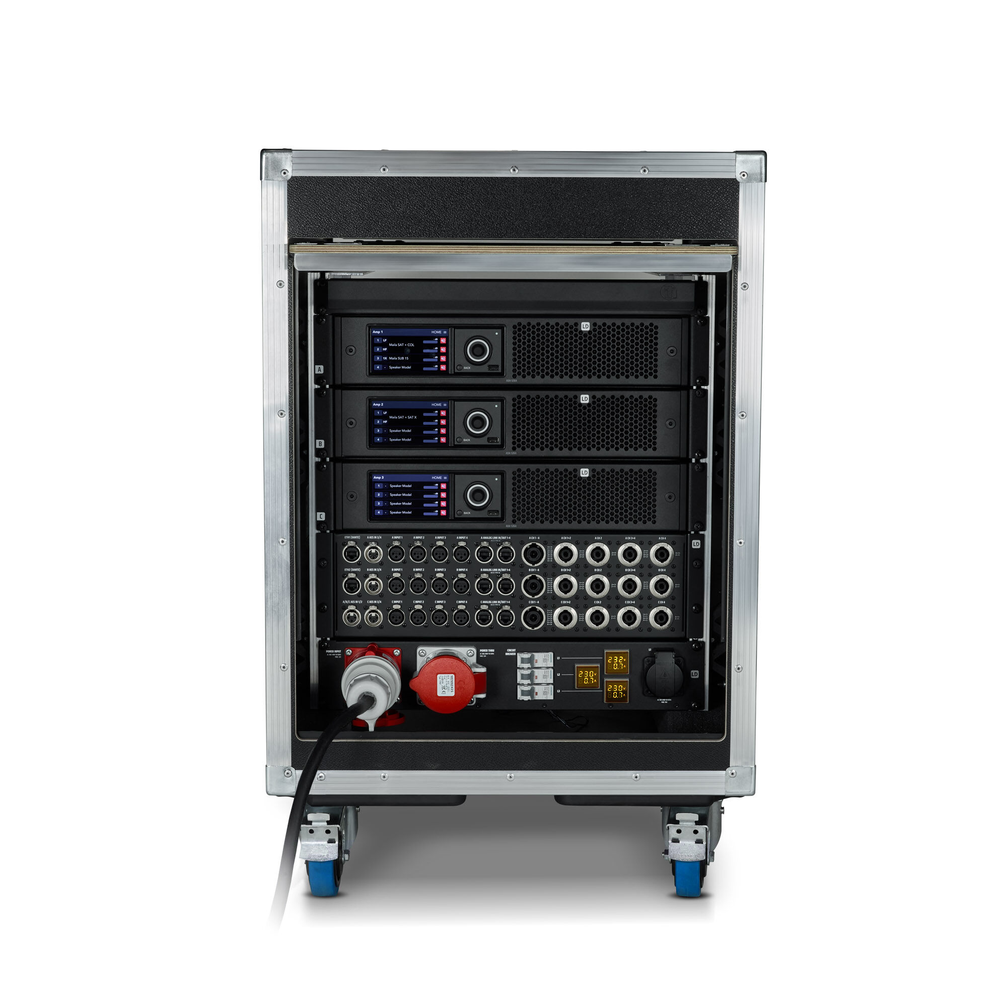 Alle Komponenten sitzen in einem 12HE Touring-Rack mit Stoßdämpfung und zwei versenkbaren Türen, für geschützten Transport und schnellen Zugriff vor Ort. Das 3HE ADA TPP Patchpanel mit klarer, Tour-tauglicher Beschriftung und premium Neutrik®-Anschlüssen bietet direkten Zugriff auf die drei Verstärker an der Vorderseite.