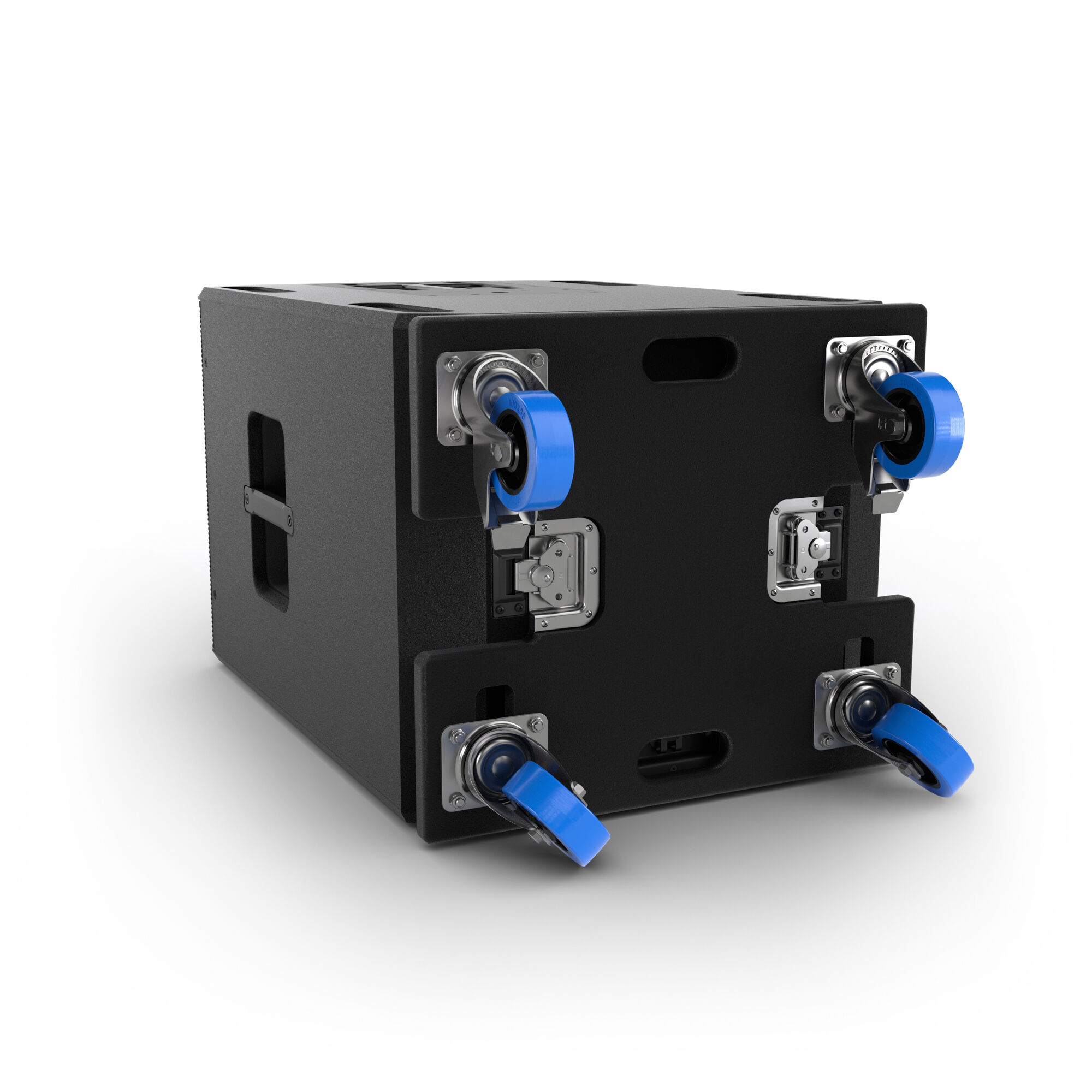 Mit vier 100 mm Schwerlastrollen, davon zwei gebremst, lässt sich der Subwoofer mühelos bewegen. Zwei Butterfly-Verschlüsse sorgen für eine sichere Befestigung des Subwoofers auf dem Rollbrett. Die stapelbare Bauweise ermöglicht eine platzsparende Lagerung, was besonders in professionellen Umgebungen von Vorteil ist.