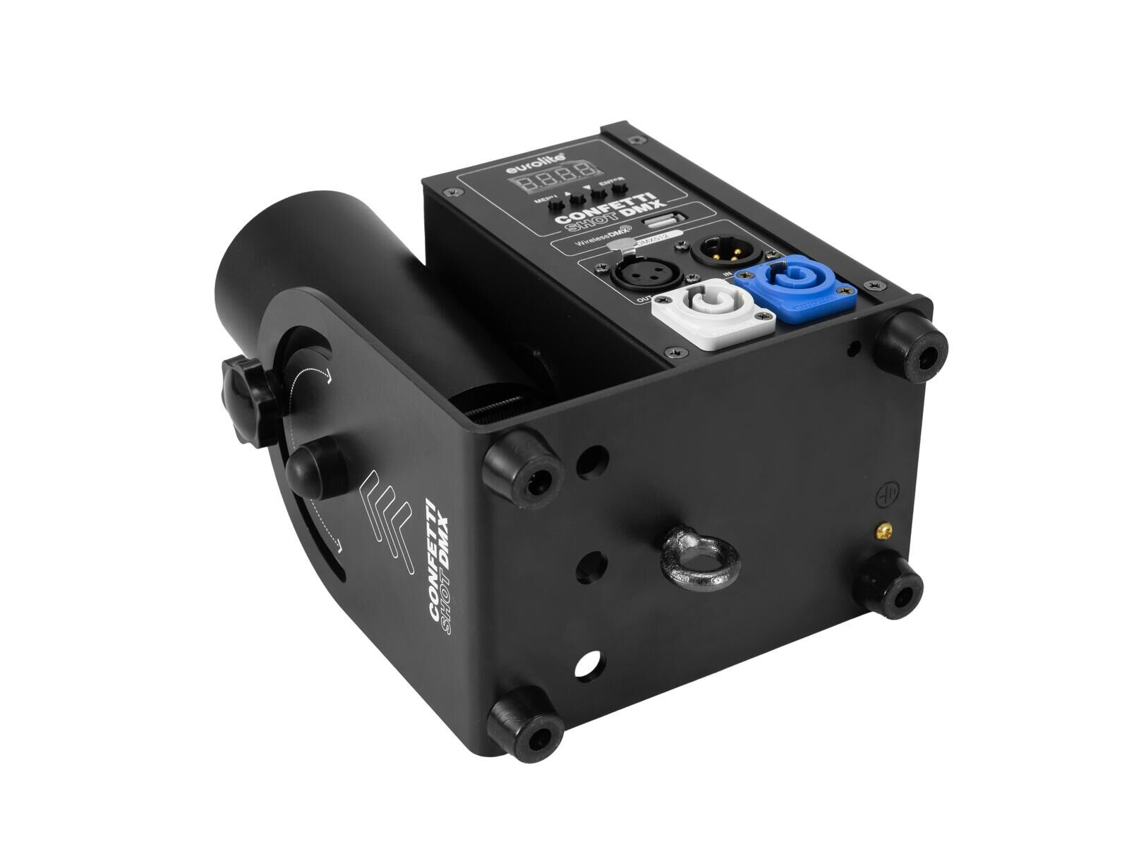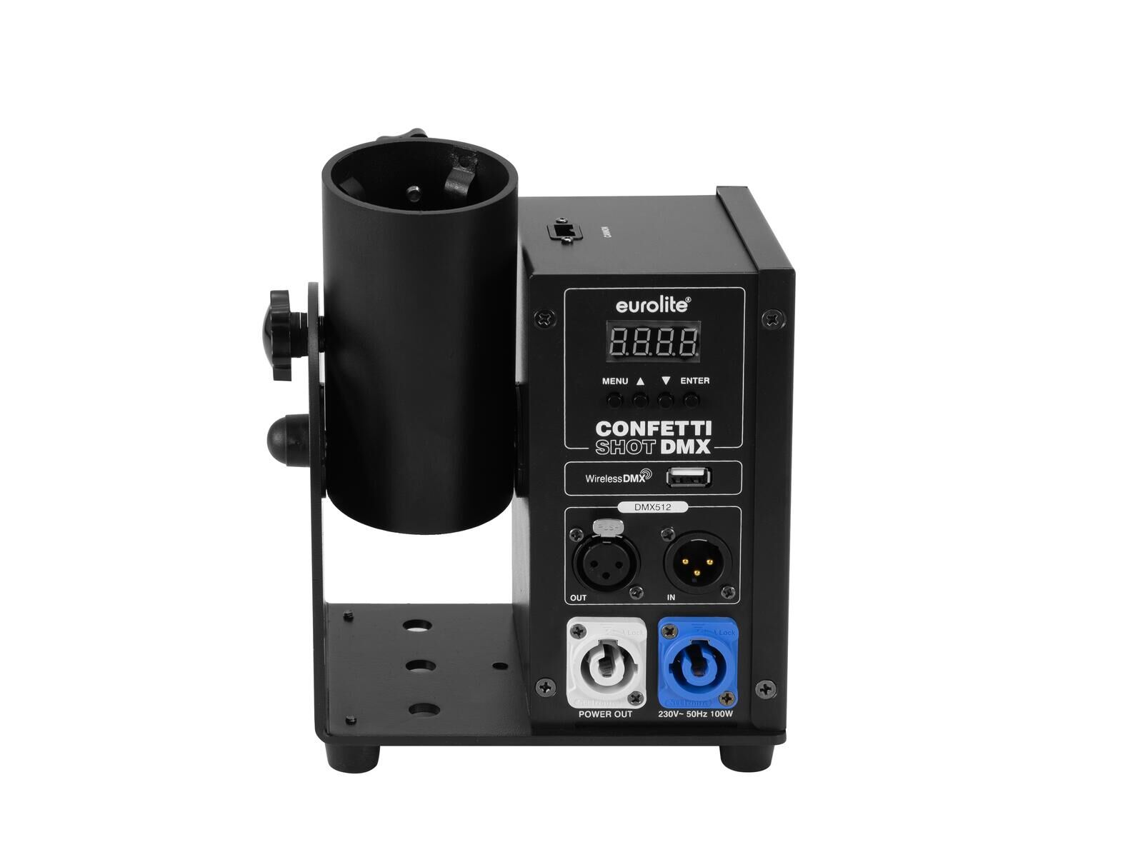 Die Einheit ist DMX-steuerbar und unterstützt optional QuickDMX, W-DMX und CRMX über USB. Ein 4-stelliges 7-Segment-LED-Display bietet eine klare Anzeige der Einstellungen. Der EUROLITE Confetti Shot DMX ist ideal für Hochzeiten, Galas, Events, Bühnen und Theater sowie für Verleiher geeignet.