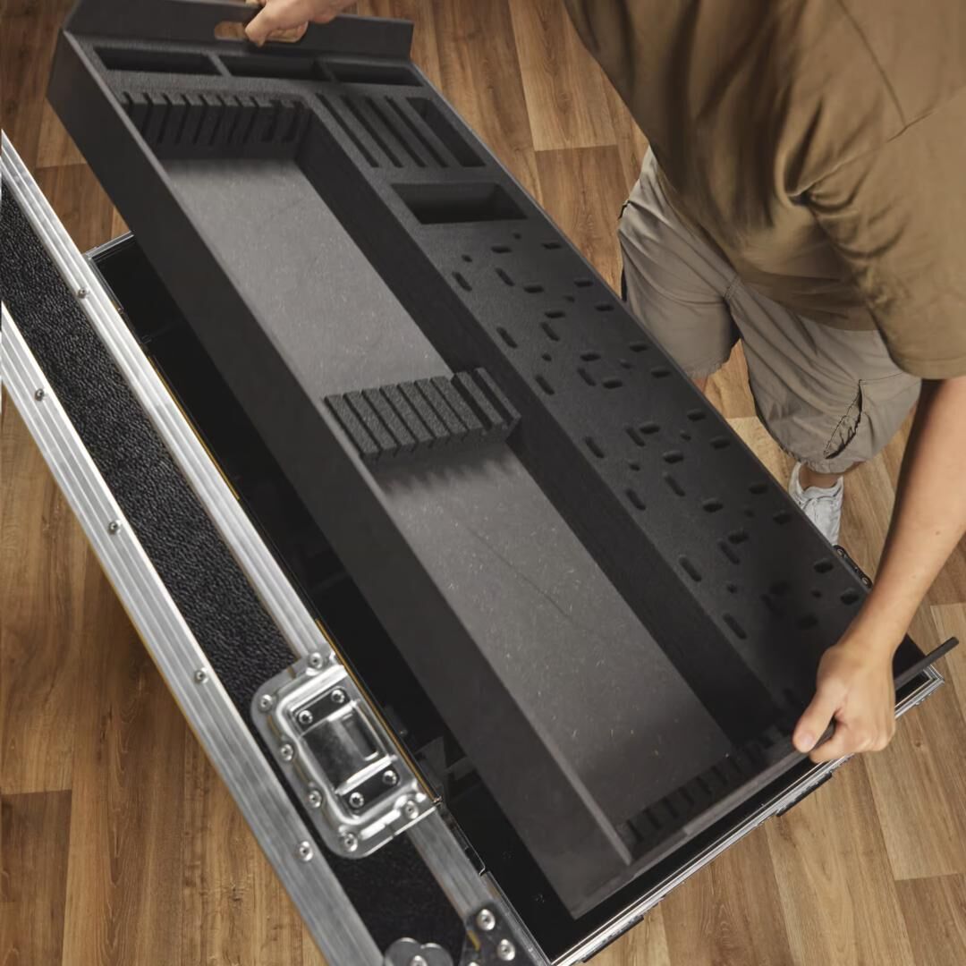Besonders durchdacht ist der zusätzliche Einsatz mit präzisen Schaumstofffräsungen für das passende Zubehör: bis zu 10x Stack/Hanging Kit, 4x Verti-Mount, 4x M20 Adapter, 8x Blenden sowie 16x Filter finden strukturiert Platz. Das spart separate Koffer, beschleunigt Rigg- und Abbauzeiten und hält alle Komponenten sofort griffbereit. Für Produktionsfirmen, Verleiher und Tour-Crews bedeutet das weniger Suchaufwand und mehr Effizienz am Set.