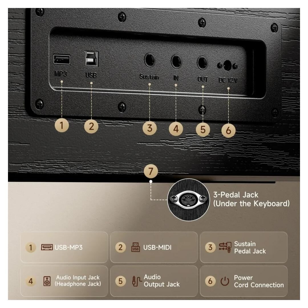 - 3-Pedal-Einheit mit Sustain, Soft und Sostenuto für klassische Klaviersteuerung und optimale Phrasierung