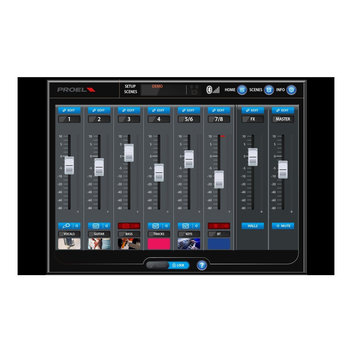 Der eingebaute 8-Kanal-Digitalmixer bietet vier wählbare MIC/LINE/INSTRUMENT-Eingänge, zwei Stereo-Line-Eingänge und Bluetooth für kabelloses Audio-Streaming. Jeder Kanal verfügt über einen 4-Band-Parametrischen EQ und einen Vollparameter-Kompressor. Die Mastersektion bietet einen 7-Band-Grafik-EQ mit fünf Benutzer-Voreinstellungen und einen Studio-Effektprozessor. Die Steuerung erfolgt entweder direkt über das große LCD-Display mit Multifunktionsknopf oder per Bluetooth 5.0 Low Energy (BLE) über die dedizierte App für Android und iOS.