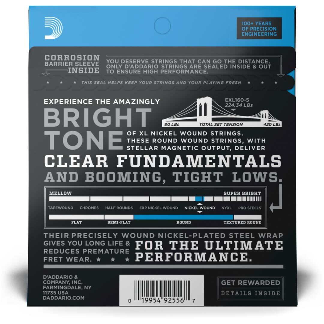 Die D'Addario EXL160-5 ist ein hochwertiger Saitensatz für E-Bass und wurde für zuverlässige Performance auf Probe, Bühne und im Studio entwickelt. Die Serie Nickel Wound steht für konstante Qualität, stimmstabile Ansprache und ein ausgewogenes Spielgefühl.