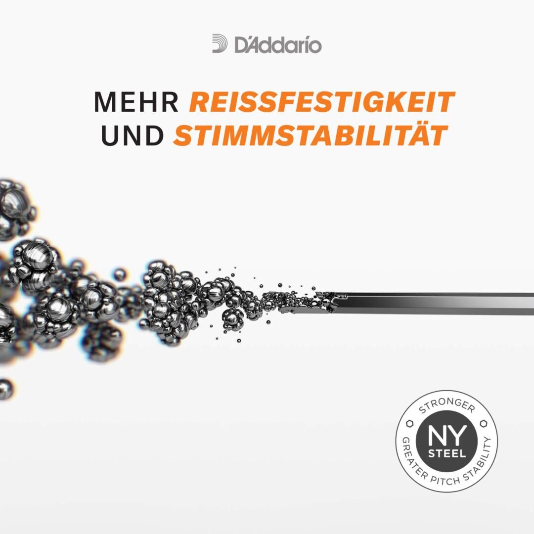 D'Addario setzt bei diesem Modell auf bewährte Fertigungsstandards mit gleichbleibender Saitenqualität. Das Ergebnis ist ein transparenter Grundklang mit sauberer Intonation, stabiler Stimmung und langer Einsatzfähigkeit im Alltag.