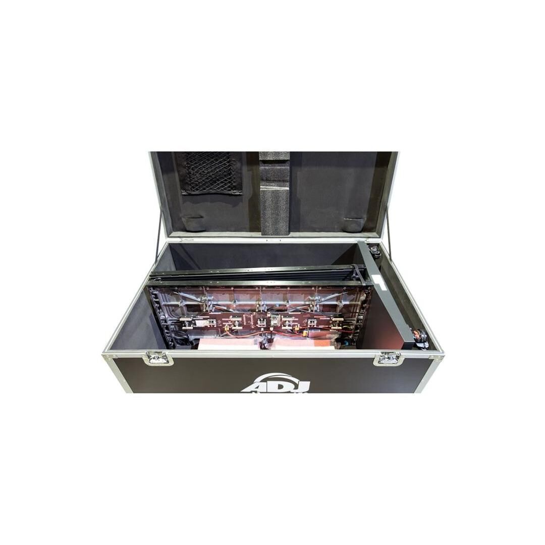 Für den mobilen Einsatz liefert ADJ ein passgenaues Single‑System‑Flightcase mit. Das komplette System misst aufgebaut 679,6 x 499,8 x 2141 mm; die schlanke Panelkonstruktion mit rund 33 mm Tiefe (33,4 mm) wirkt modern und platzsparend. Ob am Messestand, im Showroom oder im Foyer – das WMS2 Media Sys bietet ein praktisches, transportfähiges Set-up für hochwirksame LED‑Displays.