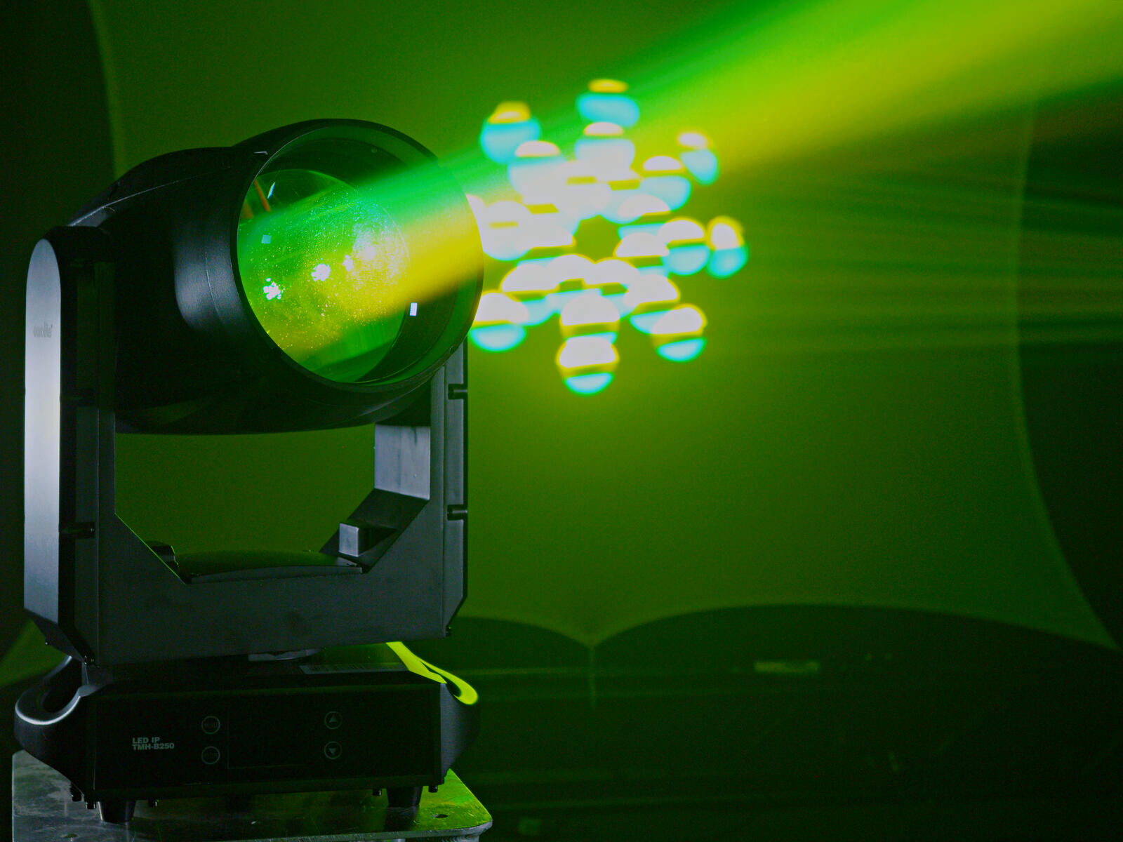 In der Praxis überzeugt der TMH-B250 mit flexiblen Steuerungswegen: DMX (14/16 Kanäle), RDM, Stand-alone, Master/Slave sowie musikgesteuerter Betrieb über Mikrofon stehen zur Verfügung. Die Projektion ist dank 4000 Hz PWM flimmerfrei – ein Pluspunkt für Kamera-, Streaming- und TV-Setups. Ein Strobe mit 1–20 Hz sorgt für zusätzliche Akzente, während das mehrfarbige LCD-Display eine zügige Einrichtung unterstützt.
