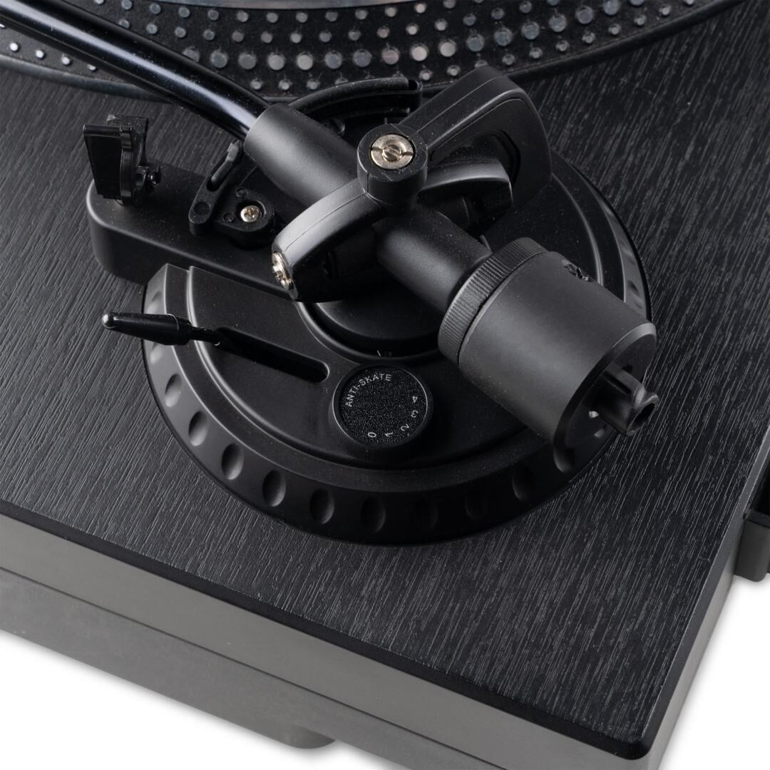 - S-förmiger Tonarm mit Anti-Skating und einstellbarem Gegengewicht für saubere Abtastung