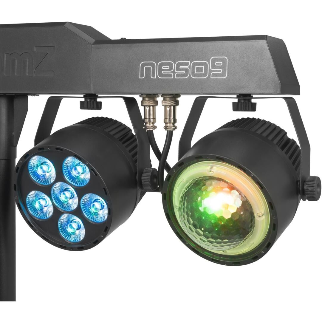 Die universelle Stromversorgung (100–240 V AC, 50/60 Hz) sorgt dafür, dass die Neso9 nahezu überall betrieben werden kann. Unterm Strich erhalten Sie ein vollständiges Lichtset, das ohne Zusatzgeräte funktioniert, sich einfach bedienen lässt und dennoch genug Tiefe für DMX-Setups bietet – ein durchdachtes Werkzeug für stimmungsvolle Eventbeleuchtung.