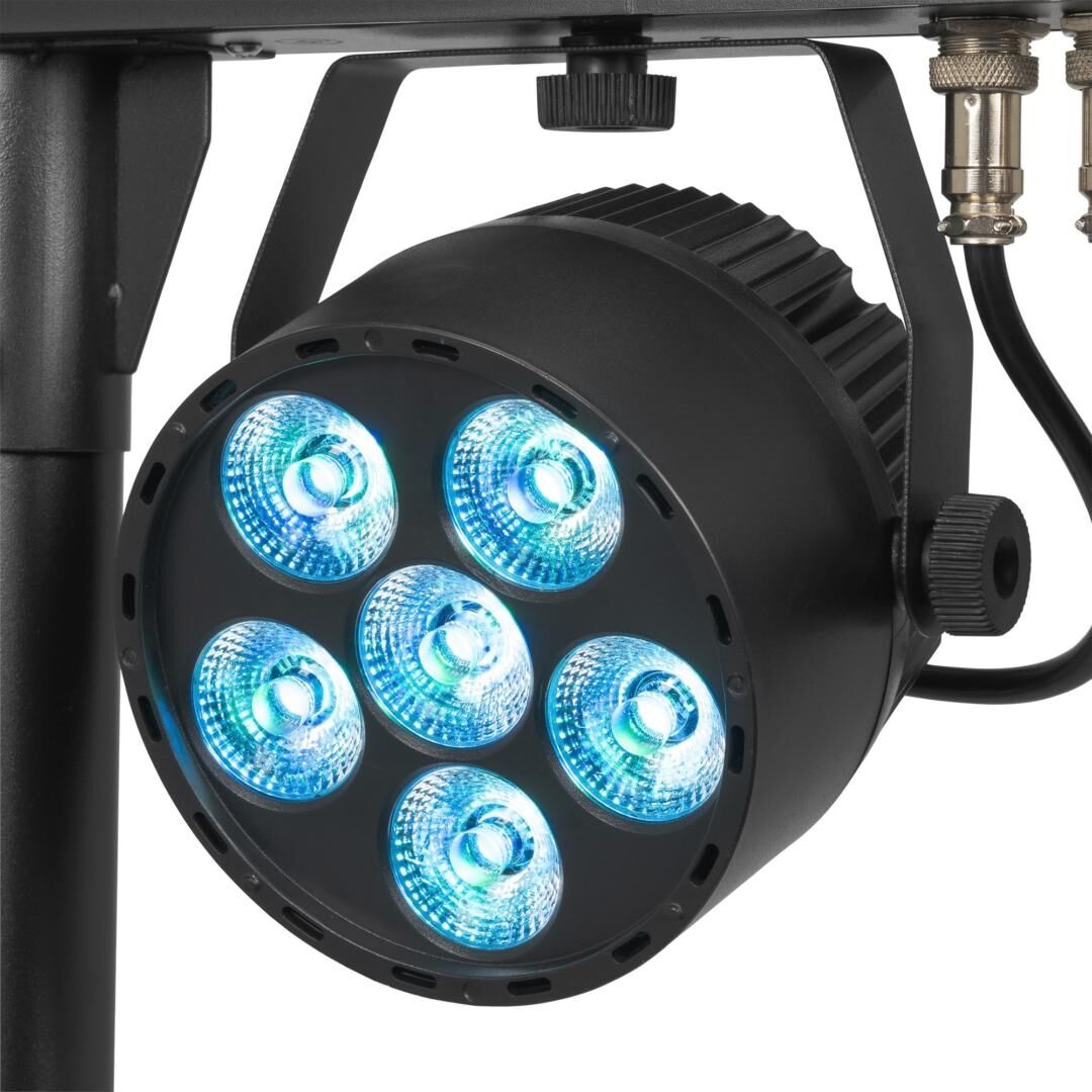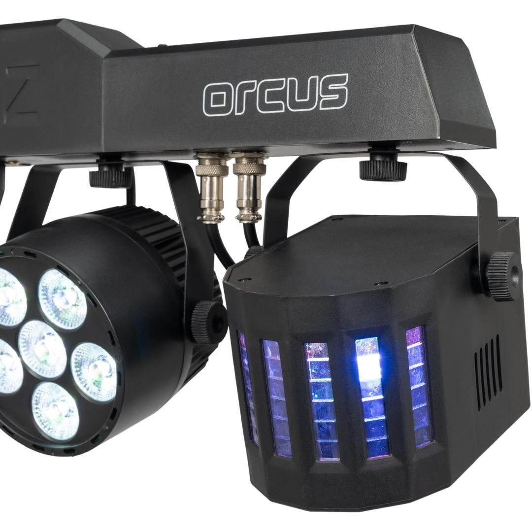 Herzstück der Orcus sind 4-in-1 RGBW-LEDs (Rot, Grün, Blau, Weiß) für sauberes, lebendiges Farbmixing. Die PAR-Spots liefern gleichmäßige Washes, während die Derby-Module für bewegte, raumfüllende Effekte sorgen. So entsteht ein vollständiges Lichtbild aus Grundfarbe, Akzent und Bewegung – passend für Tanzflächen, Moderationen oder Live-Sets in kleinen bis mittleren Räumen.