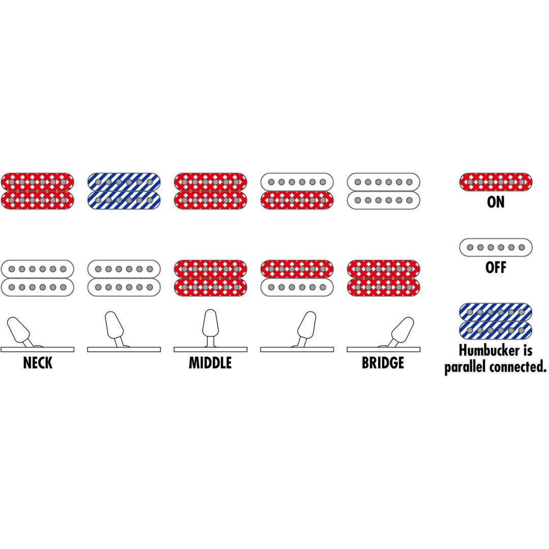 Klanglich liefert das H-H-Setup mit zwei Quantum-7 Humbuckern definierte Tiefmitten, schnelle Transienten und Klarheit in der tiefen B-Saite. Über den Fünfwegeschalter stehen mehrere praxisnahe Voicings zur Verfügung – von druckvollen Rhythmussounds bis zu durchsetzungsfähigen Leads. Die einfache Elektronik mit Master-Volume und Master-Tone hält den Signalweg direkt und verlässlich.