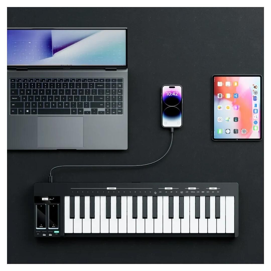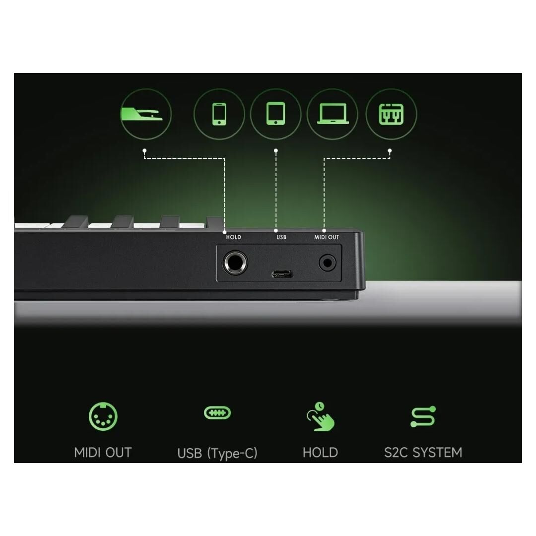 In Sachen Konnektivität deckt das Keyboard USB‑MIDI und Classic MIDI ab und arbeitet damit flexibel mit Computer, Tablet oder Smartphone zusammen. Die Einbindung in gängige DAWs ist schnell erledigt, sodass Sie unmittelbar loslegen können – vom Skizzieren neuer Ideen bis zur Aufnahme kompletter Arrangements.