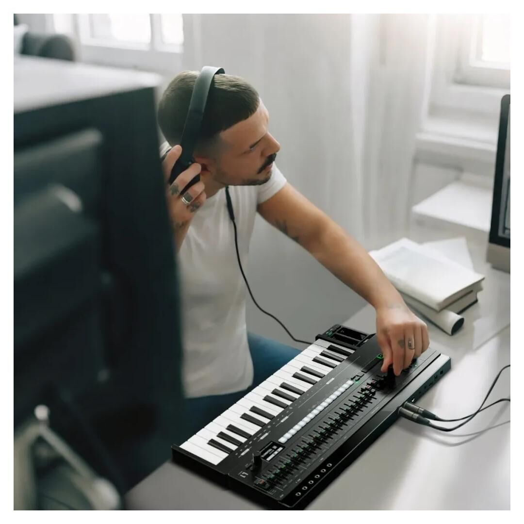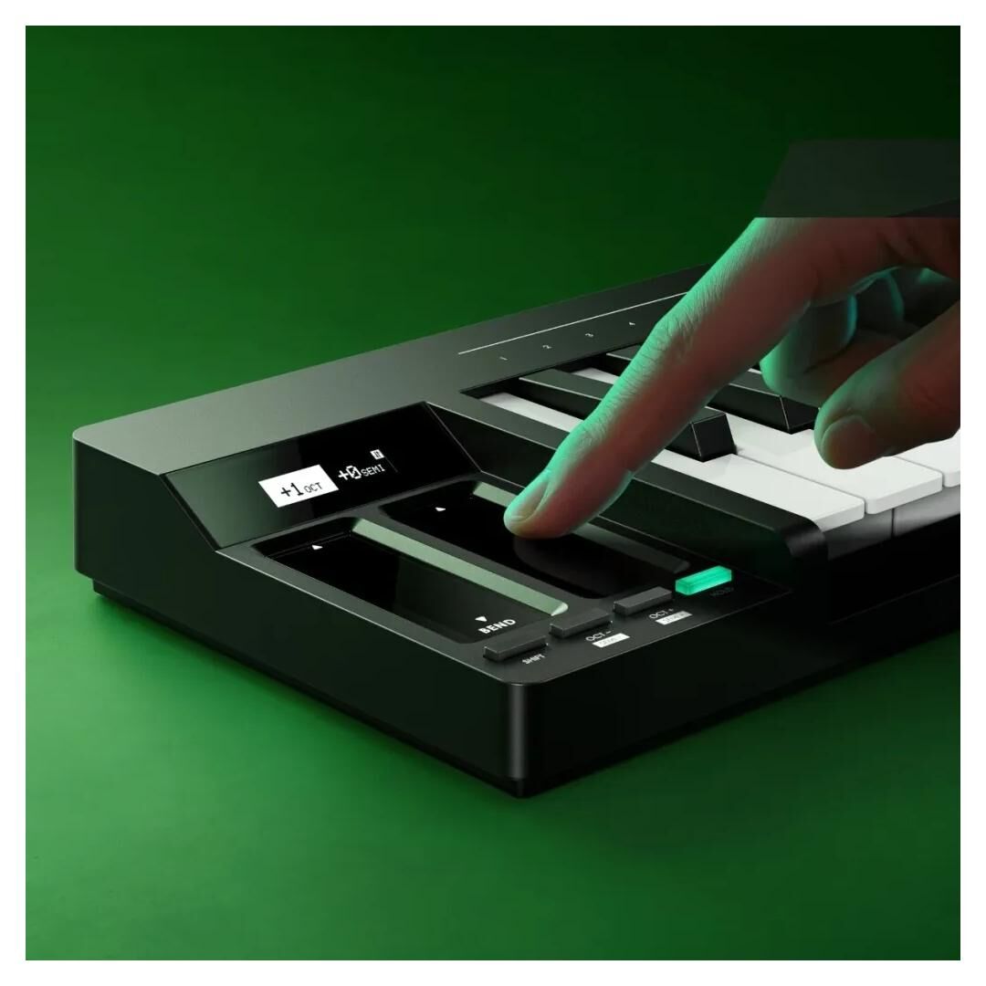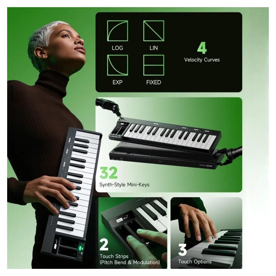 Die 32 Tasten mit Synth‑Action und Federmechanik bieten ein direktes, reaktionsschnelles Spielgefühl. Drei einstellbare Empfindlichkeitsstufen (Velocity) passen die Anschlagdynamik an den persönlichen Stil an – ideal für präzise Basslines, Akkordbegleitung oder melodische Leads. So lässt sich das Spielverhalten gezielt auf unterschiedliche Genres und Spieltechniken abstimmen.