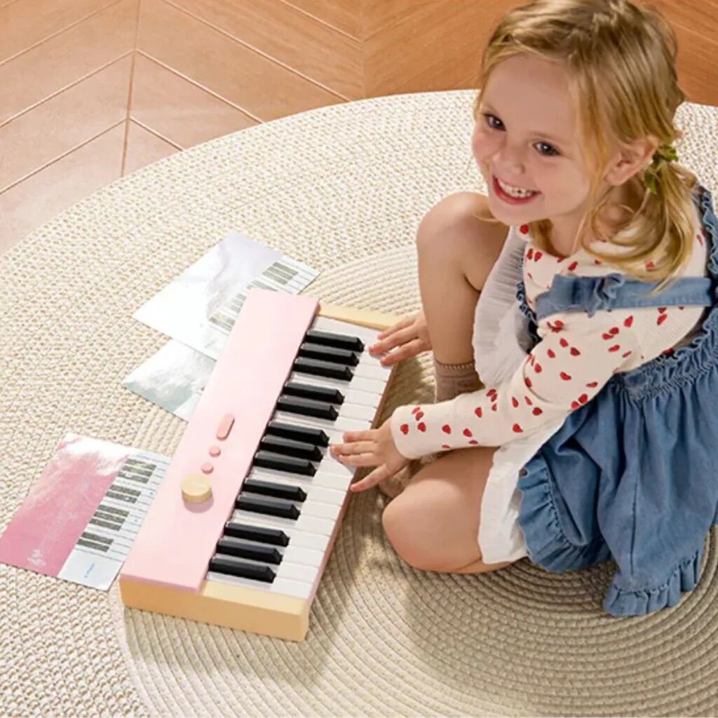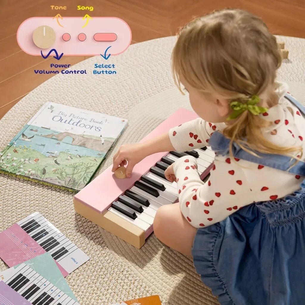 Das Piano ist aus massivem Holz gefertigt und erfüllt strenge CPC-Sicherheitsstandards. Alle Kanten sind glatt und abgerundet, sodass Kinder sicher spielen und experimentieren können. Die stabile Konstruktion und die einfachen Bedienelemente machen das Instrument robust und leicht zu handhaben – auch für jüngere Kinder.