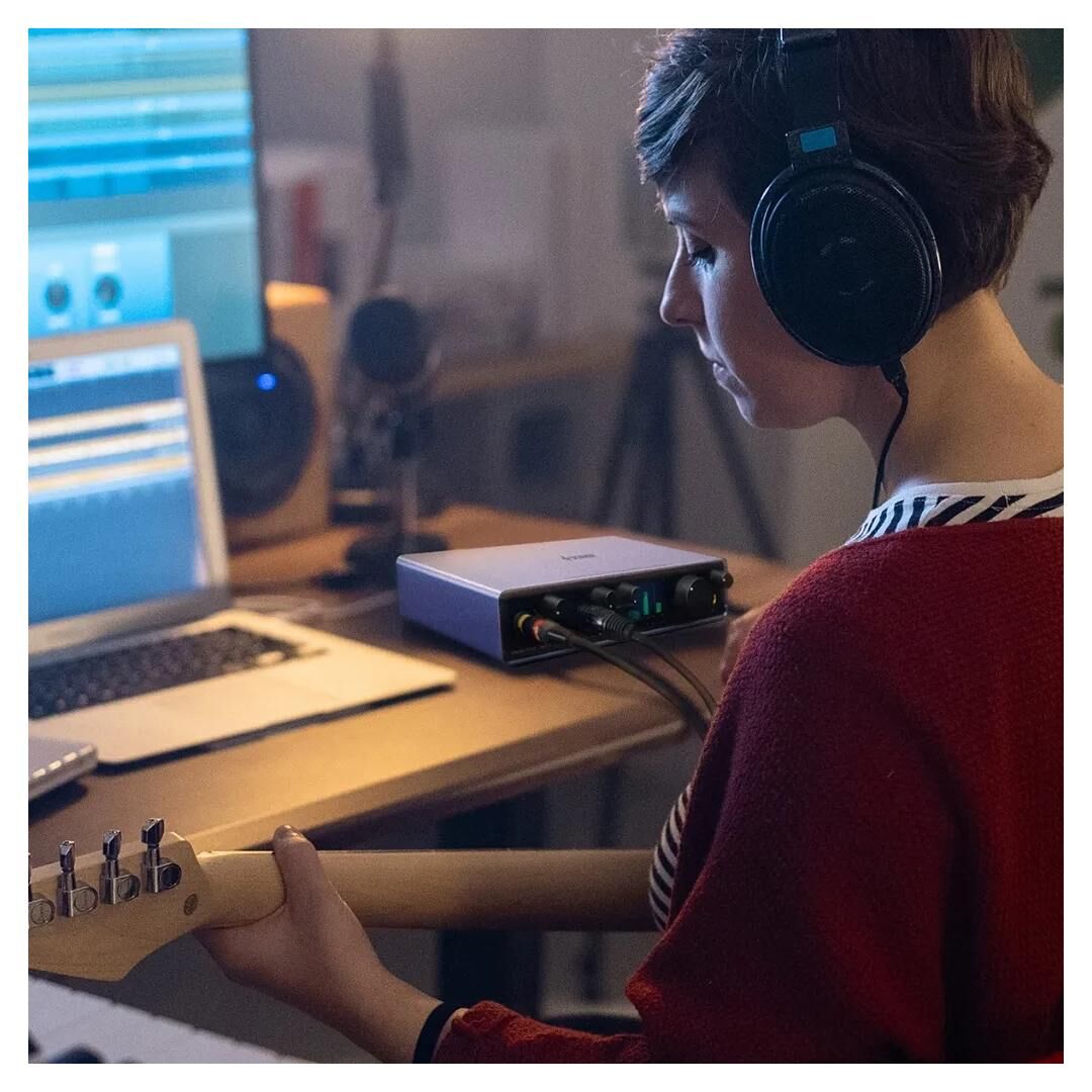 Die Wandlung in 24 Bit/192 kHz sorgt für eine detailreiche, saubere Signalverarbeitung mit großem Dynamikumfang. Für das Monitoring stehen ein Kopfhörerausgang mit eigenem Lautstärkeregler sowie Stereo-Cinch-Ausgänge (RCA) zur Verfügung, an die Sie Ihre Lautsprecher anschließen. Damit hören Sie Ihre Sessions wahlweise direkt am Kopfhörer oder über Begleitlautsprecher ab.