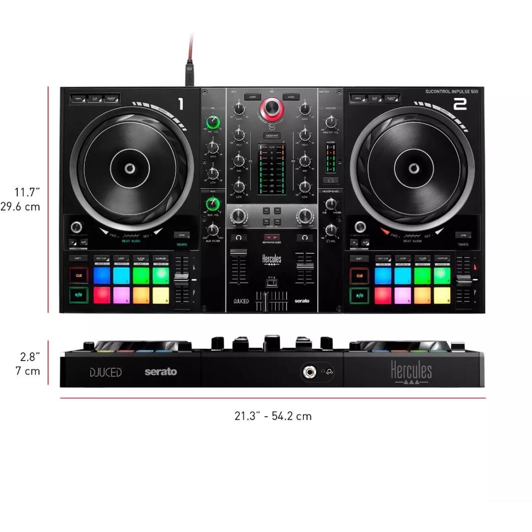 - Lieferumfang: DJControl Inpulse 500-Controller, geflochtenes USB-Kabel, Serato DJ Lite- und DJUCED-Lizenzen, Kurzanleitung & Garantieinformationen