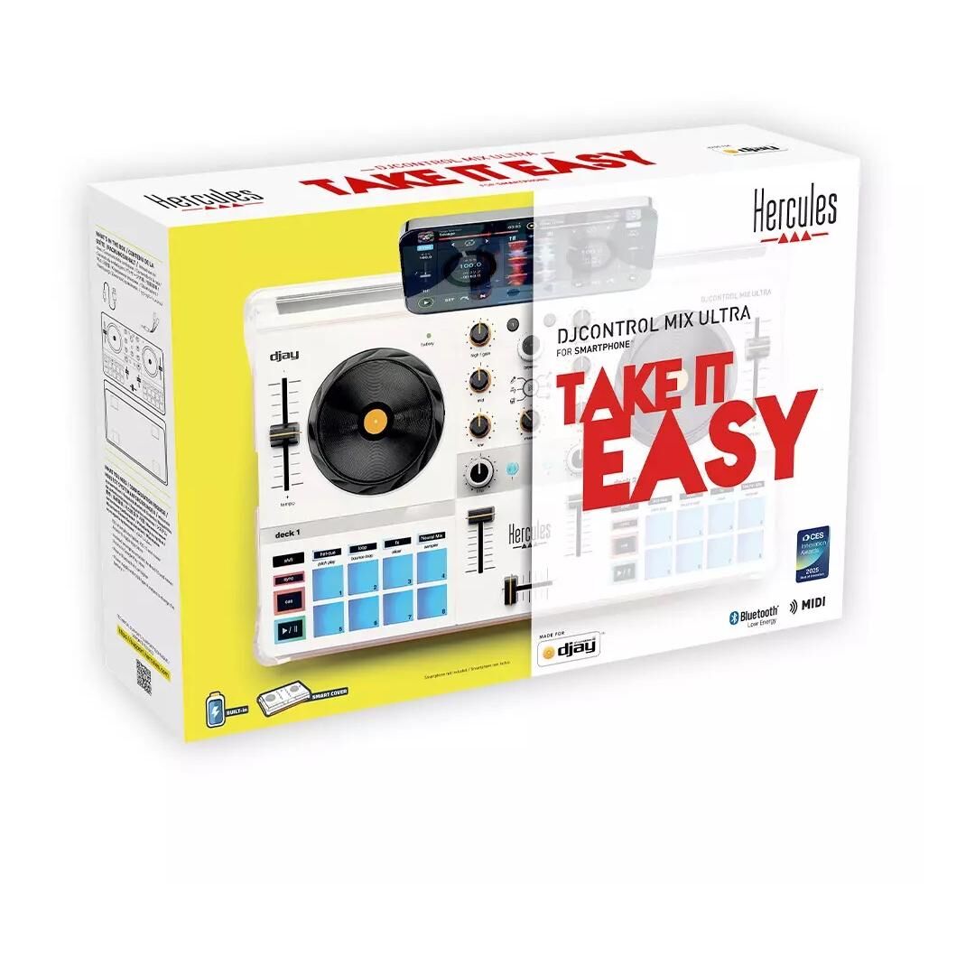 Der Hercules DJControl Mix Ultra ist ein kompakter, kabelloser 2-Deck-DJ-Controller für Smartphone und Tablet, der mobiles Auflegen besonders unkompliziert macht. Er verbindet sich per Bluetooth Low Energy (LE) mit iOS-, iPadOS- und Android-Geräten und bringt dank Plug-and-Play in wenigen Sekunden Musik zum Laufen – ganz ohne Kabelsalat. Mit an Bord sind präzise Jogwheels mit Touch-Erkennung, Pitch- und Lautstärkefader sowie FX-Tasten, damit Beats, Übergänge und Scratches sicher sitzen. Die enthaltene djay App von Algoriddim ist der ideale Software-Partner und schaltet beim DJControl Mix Ultra das Neural Mix-Feature frei. So entsteht ein vollständiges, mobiles DJ-Setup, das in jeden Rucksack passt.