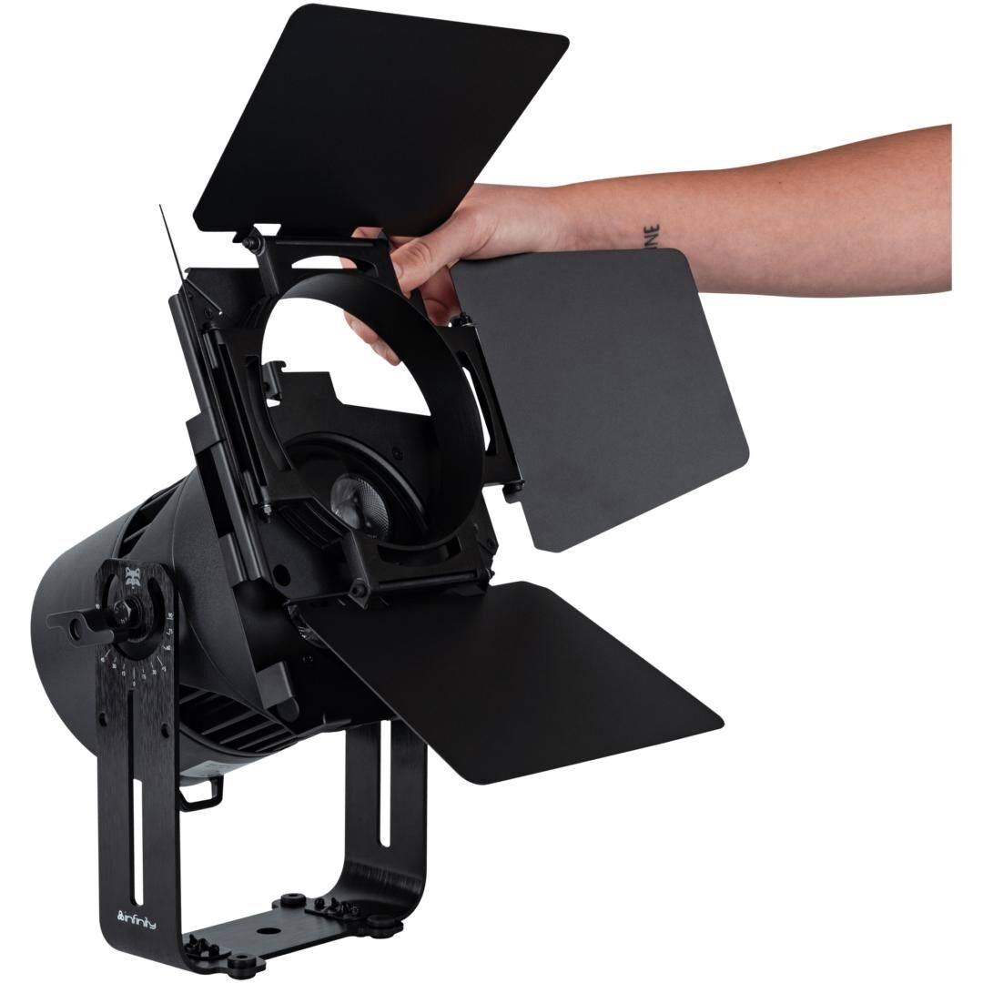 Mit einer Breite von 200 mm und einem Gewicht von 1 kg bietet die Torblende eine stabile, langlebige Lösung für den täglichen Einsatz. Die vier einzeln verstellbaren Flügel erleichtern das gezielte Lenken des Lichts am Infinity Raccoon Junior und helfen, Lichtspill zu vermeiden und Kanten definierter zu setzen.