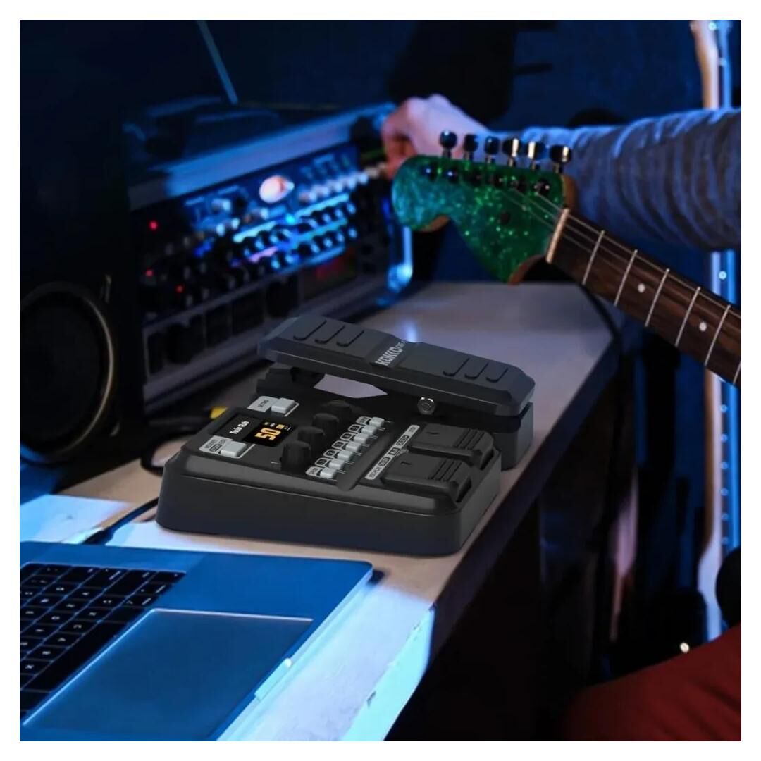Das Gerät verfügt über fünf frei belegbare Effektblöcke mit insgesamt mehr als 50 integrierten Effekten. Dazu zählen Overdrives, Modulationen, Delays, Reverbs, Dynamik‑Effekte und Filter, die individuell angepasst werden können. Mit dem 30‑Sekunden‑Looper lassen sich Riffs aufnehmen und Schichten aufbauen, während die Drum‑Maschine 40 Rhythmen in sechs Stilrichtungen bereitstellt – ideal zum Üben, Jammen oder Songwriting.