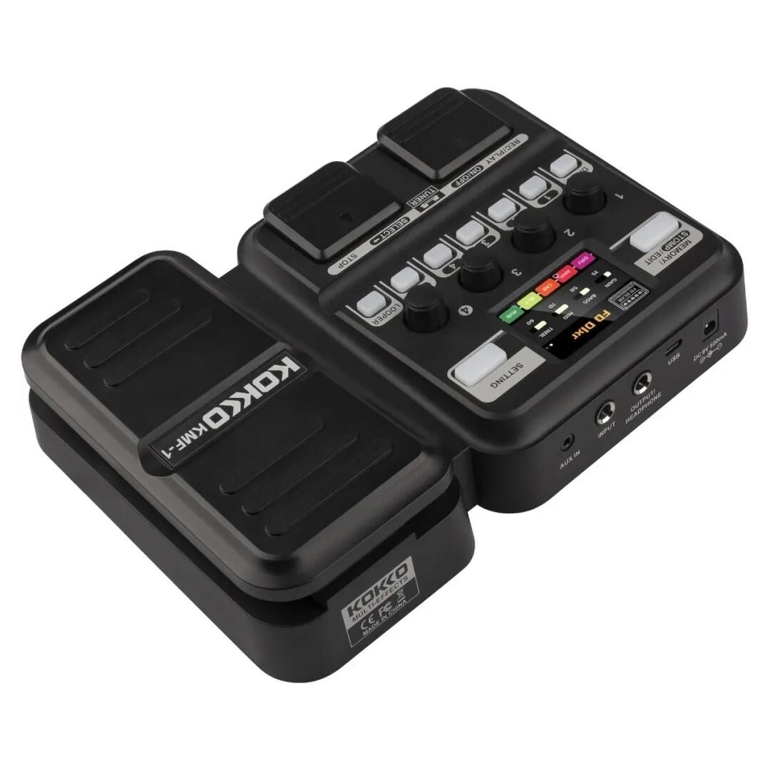 Der KMF‑1 bietet flexible Anschlussmöglichkeiten: AUX‑IN für Backing‑Tracks, Kopfhörerausgang für lautloses Üben, USB‑Type‑C für Firmware‑Updates und Line‑Out für den direkten Anschluss an Verstärker, PA‑Systeme oder Aufnahmegeräte. Das Expression‑Pedal kann für Lautstärke, Wah oder Effektsteuerung in Echtzeit genutzt werden, was ein professionelles Set‑up simuliert.