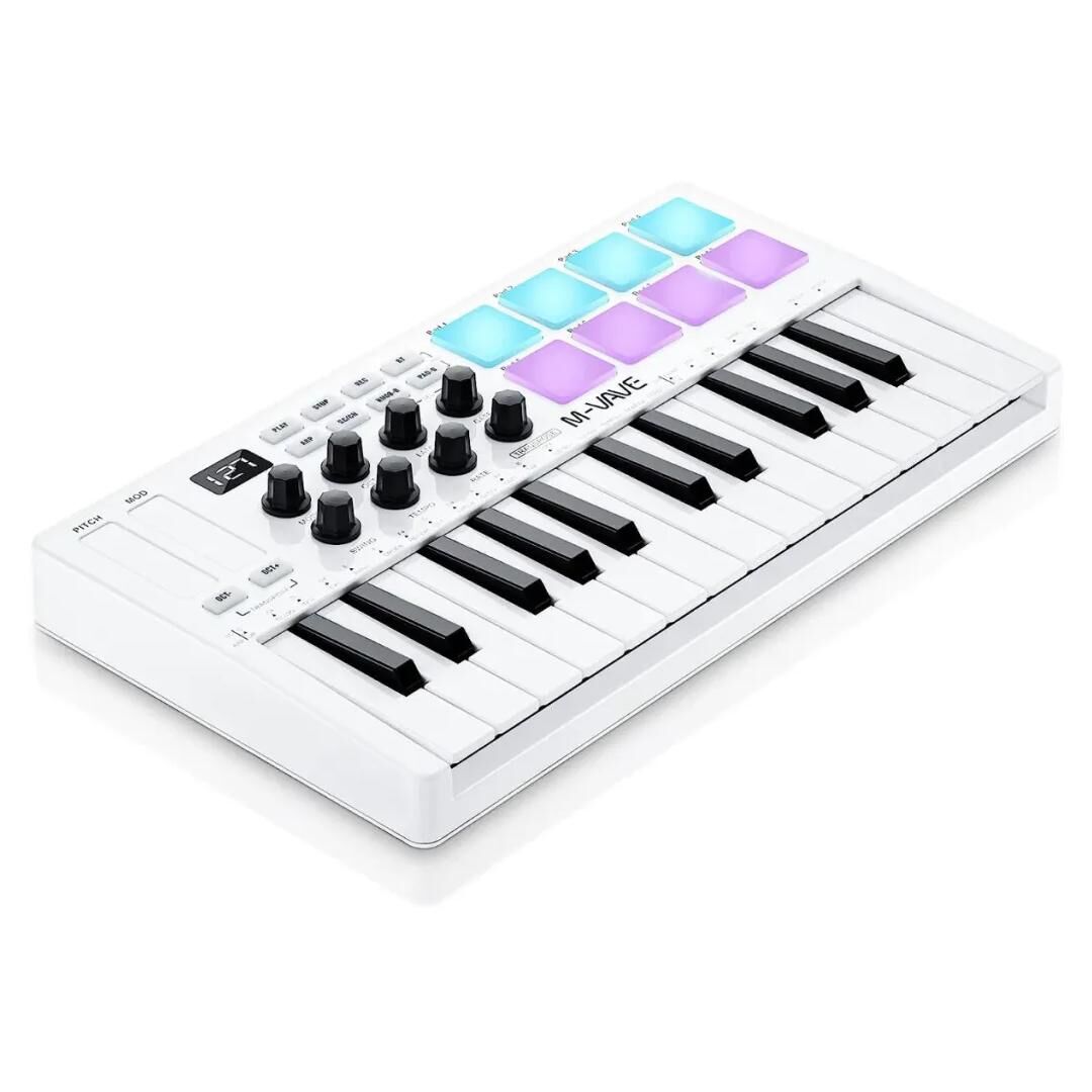 Das M-Vave SMK-25 Bluetooth Midi-Keyboard ist ein smartes und kompaktes MIDI-Keyboard mit USB-Anschluss. Es bietet 25 anspruchsvolle Mini-Tasten, 8 Hintergrundbeleuchtete und anspruchsvolle Drum-Pads, 8 drehbare Knöpfe mit wählbaren Funktionen und berührungsempfindliche Pitch- und Modulation-Strips.