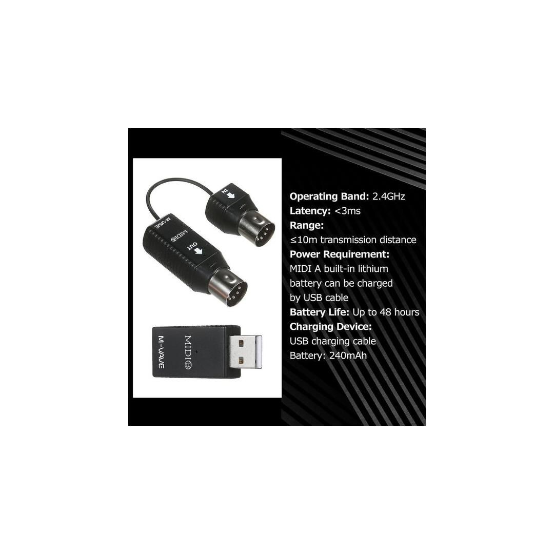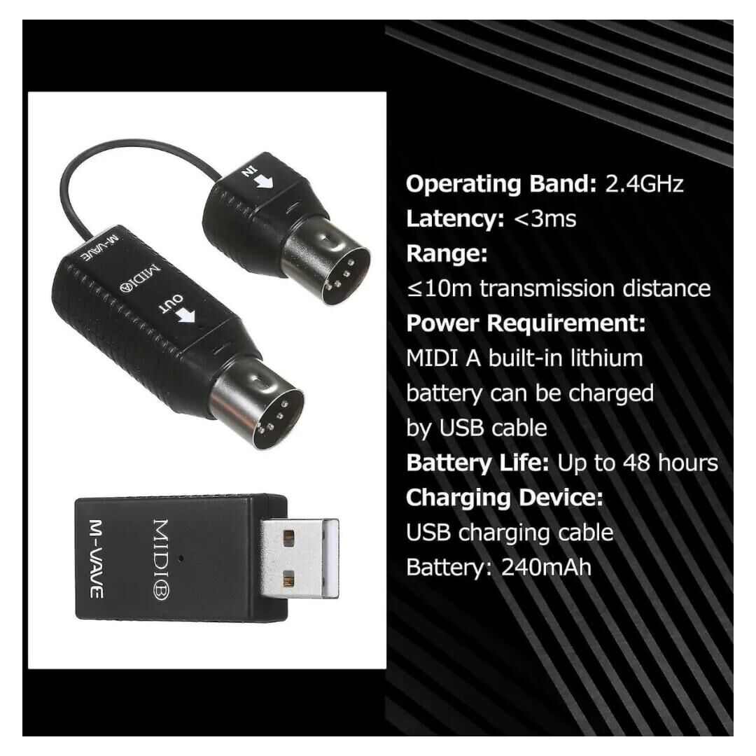 Das System kann an Standard-MIDI-Geräte mit 5-poligem DIN-Stecker angeschlossen werden und unterstützt alle MIDI-fähigen Geräte, darunter elektronische Klaviere, Keyboards, Synthesizer, digitale Mixer, MIDI-Controller, Soundkarten mit MIDI, Keytar, E-Bläser, V-Harmonikas und elektronische Trommeln. Mit zwei Sets kannst du auch eine kabellose Verbindung zwischen zwei MIDI-Keyboards herstellen.