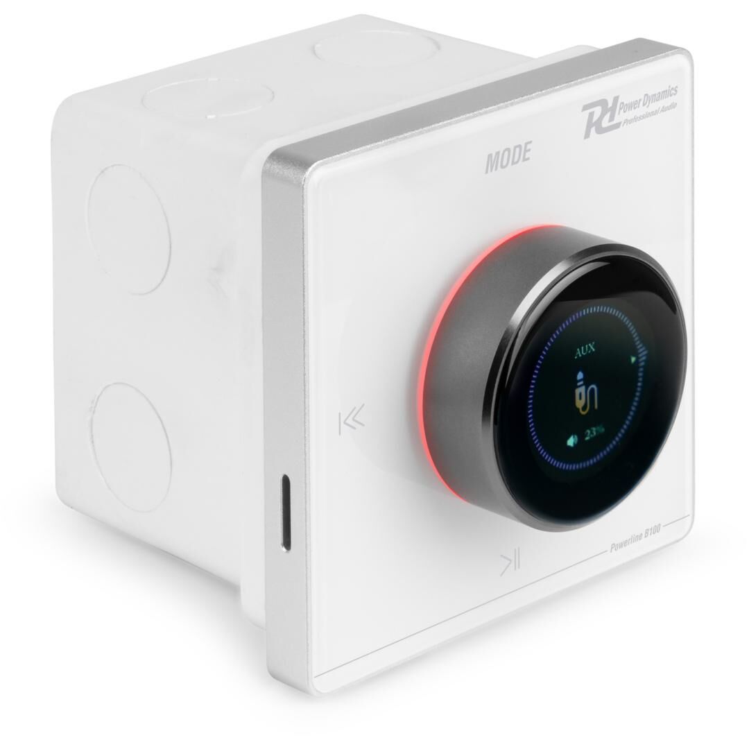 Die Bedienung ist intuitiv: Das kapazitive Touchpanel mit LCD-Anzeige liefert direkten Zugriff auf Quellen, Titelwahl und Systemfunktionen, während ein griffiger Lautstärkeregler schnelle Anpassungen erlaubt. Alternativ steuern Sie das System bequem mit der mitgelieferten kabellosen Fernbedienung – praktisch in Konferenzräumen oder Empfangsbereichen. Durch die kompakte Bauform (86 x 86 x 66 mm) benötigt der Powerline B100W nur wenig Platz in der Wand.