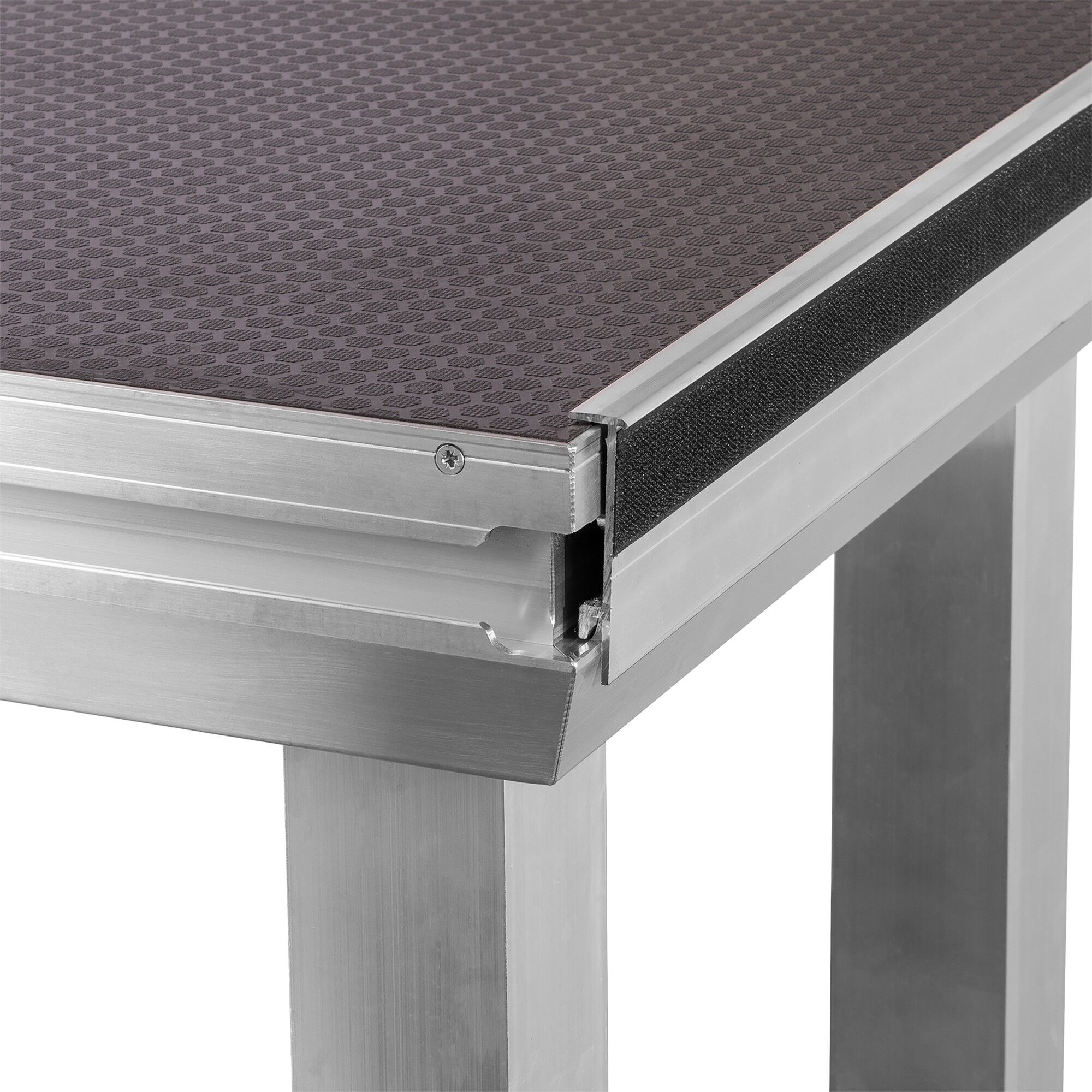 Gefertigt aus robustem Aluminium bietet das Profil eine zuverlässige, verwindungsarme Verbindung bei gleichzeitig niedrigem Eigengewicht. Die silberne Ausführung integriert sich unauffällig in unterschiedliche Bühnen-Setups und unterstützt eine professionelle Frontansicht der Bühne. Die Dimensionswerte 970 x 57 x 14 mm sind auf gängige Podestgeometrien abgestimmt und erleichtern die Planung in modularen Systemen.