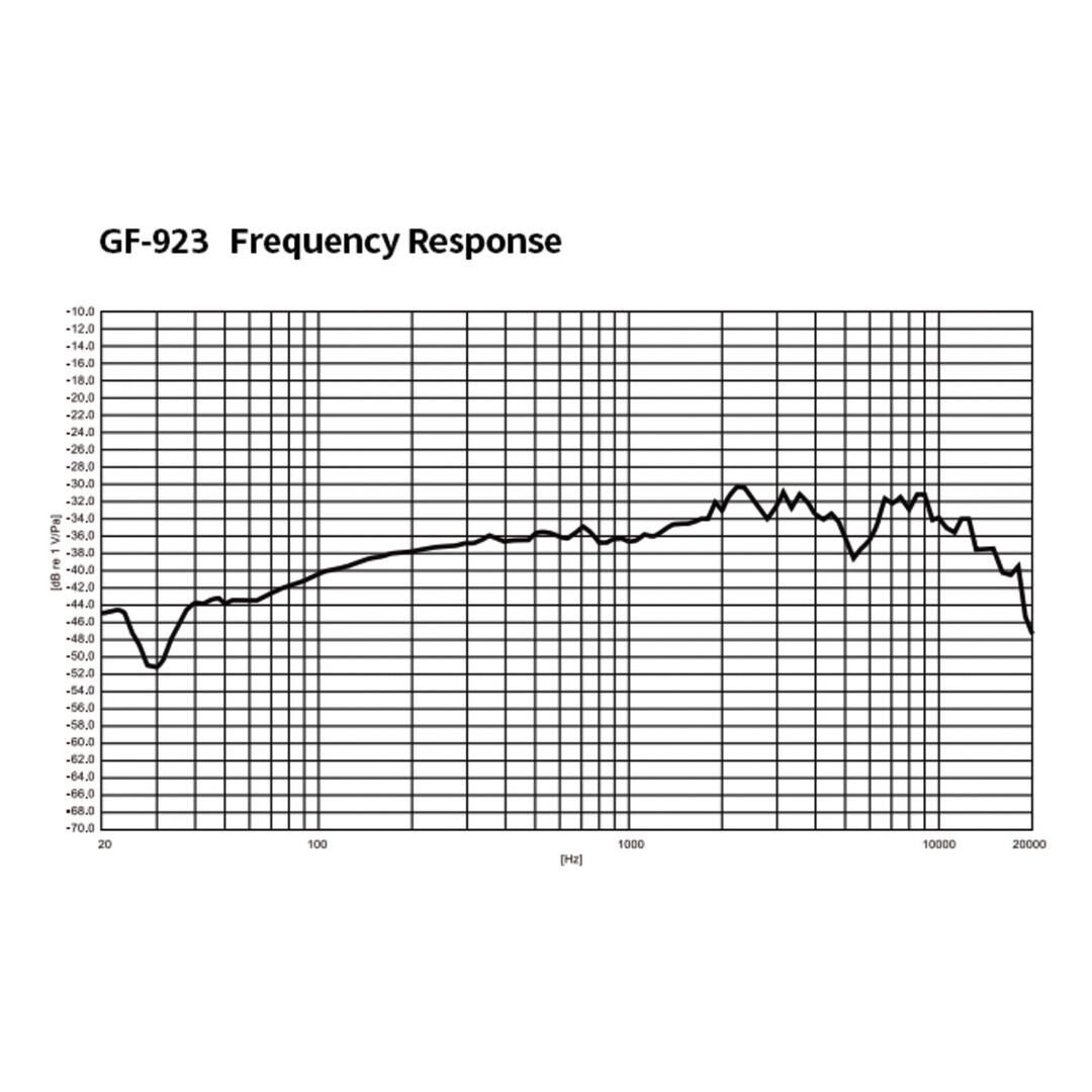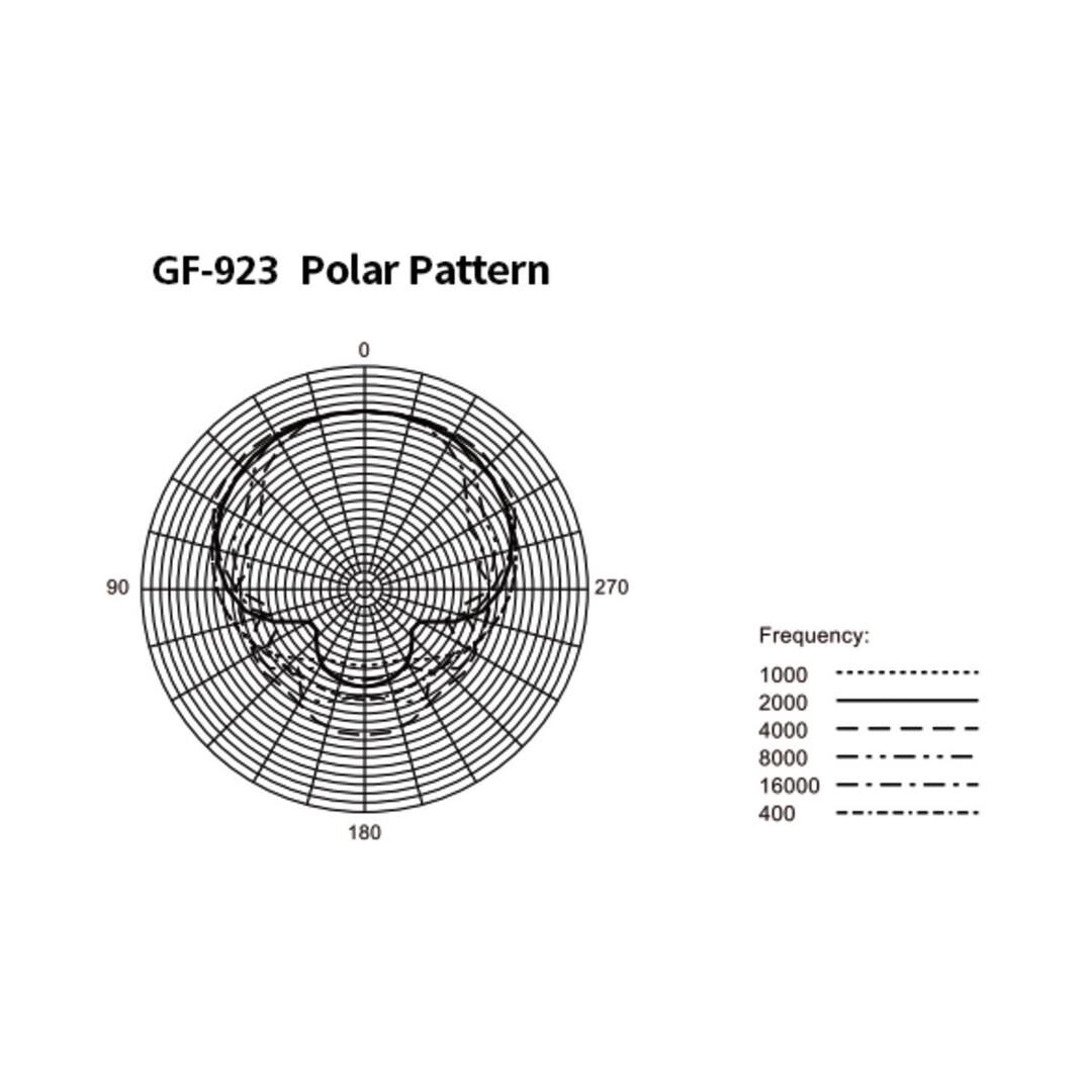 Auch technisch ist das GF-923 belastbar: Ein maximaler Schalldruckpegel von 120 dB SPL (bei 1 kHz, 1% THD) bietet ausreichend Headroom für dynamische Sprecherinnen und Sprecher. Mit einer Empfindlichkeit von -38 dBV/Pa (1 kHz) und einer geringen harmonischen Verzerrung von 0,9% bei 1 kHz liefert das Mikrofon ein sauberes, verwertbares Signal für professionelle Beschallungs- und Aufzeichnungslösungen.