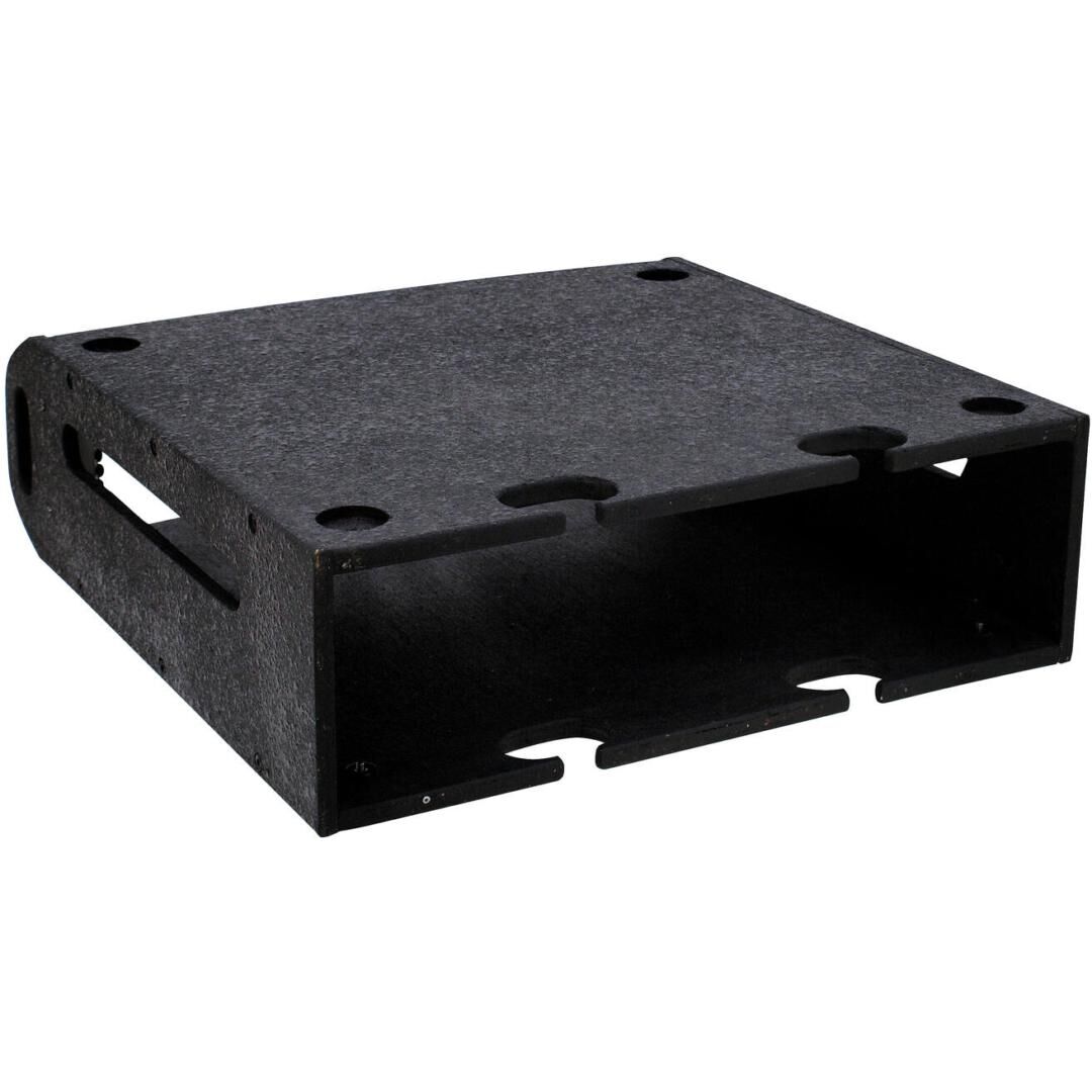 Das Gehäuse ist aus hochwertigem, mehrlagig verleimtem Schichtholz mit einer Stärke von 9 mm gefertigt. Die schwarze, strukturierte Oberfläche verleiht ihm nicht nur eine professionelle Optik, sondern sorgt auch für eine robuste und langlebige Konstruktion. Die Frontplatte ist konvex geformt und mit praktischen Griffen ausgestattet, was den Transport und die Handhabung des gefüllten Einsatzes deutlich erleichtert.