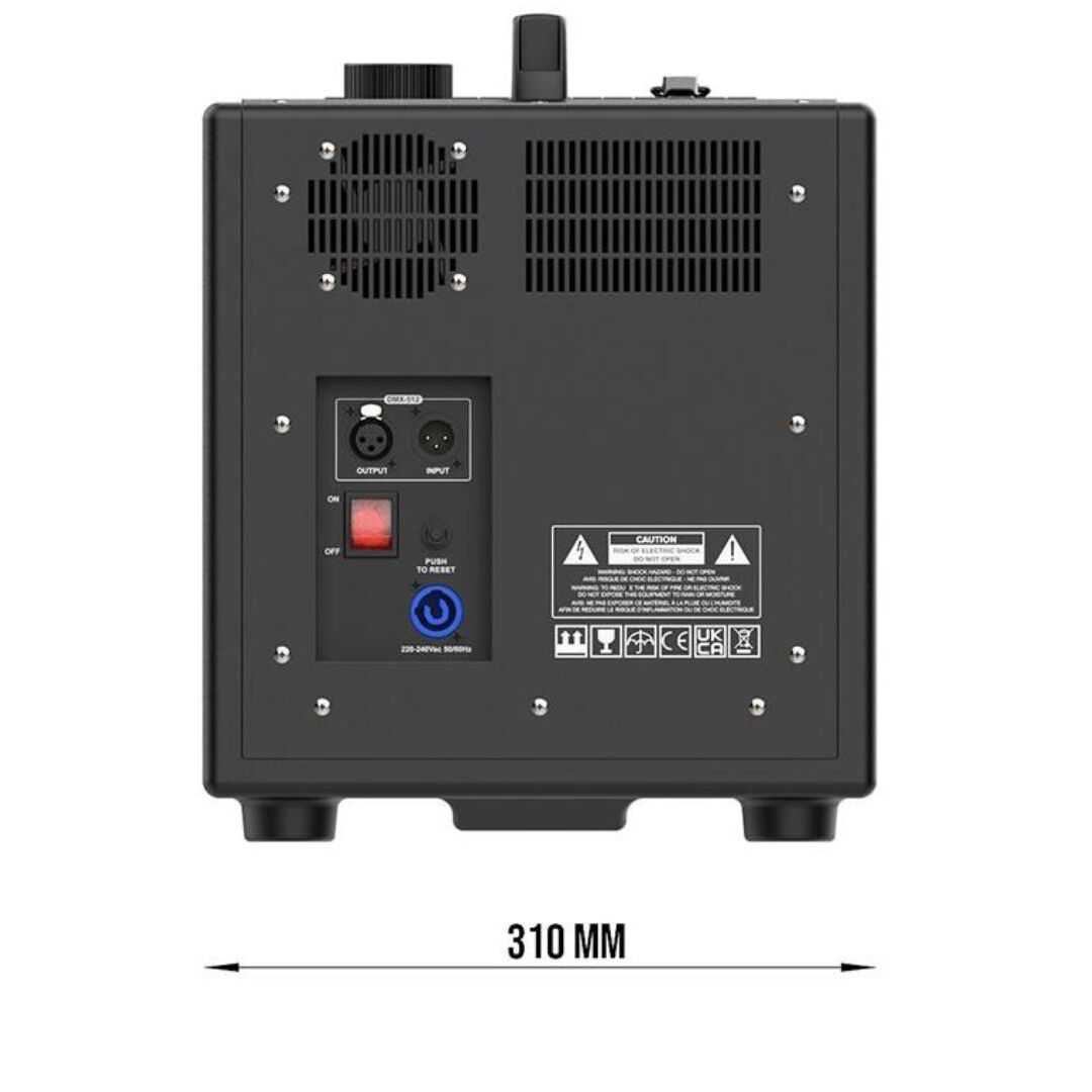 Die Steuerung ist flexibel: Über DMX (2 Kanäle) lässt sich die Maschine in Licht- und Show-Setups integrieren; alternativ steht eine integrierte manuelle Steuerung zur Verfügung, mit der Nebelintensität, Lüfter und Zeit bequem am Gerät eingestellt werden. Ein gut ablesbares LCD-Display unterstützt die schnelle Konfiguration im hektischen Veranstaltungsalltag.