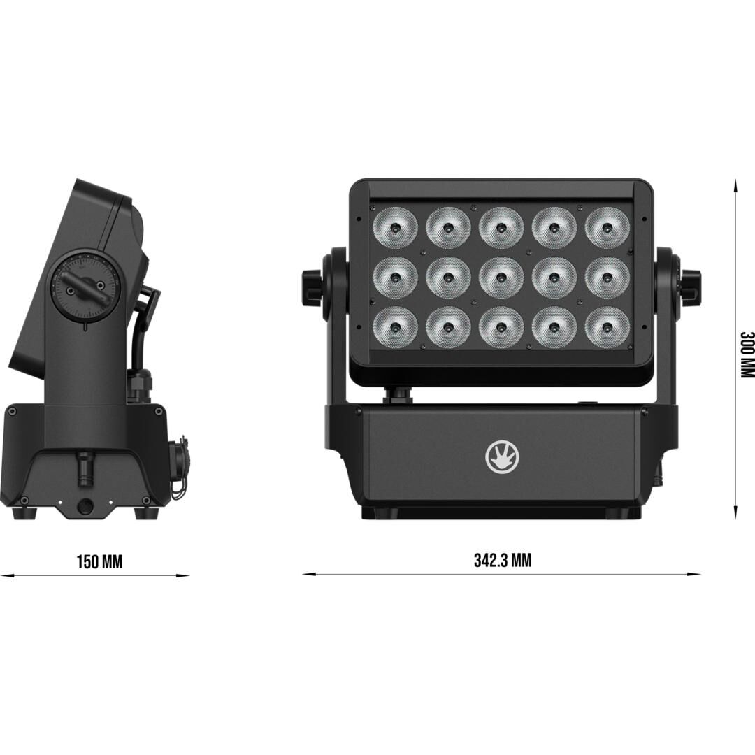 Das Gehäuse aus schwarz eloxierter Aluminiumlegierung dient der Kühlung und ist auf zuverlässigen Outdoor‑Betrieb ausgelegt (IP65, −15 °C bis 45 °C). Für die Verkabelung stehen REAN XLR‑Buchsen für Signal/Daten sowie ein POWER CON TRUE ONE‑Stromanschluss zur Verfügung. Mit Abmessungen von 32 × 42 × 25,5 cm und 8 kg lässt sich das Gerät gut riggen oder bodennah als Uplight einsetzen – robust genug für Touring und Rental.