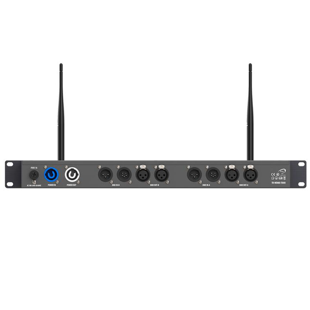 Der TRD 100 arbeitet wahlweise als Sender (TX), Empfänger (RX) oder Repeater und deckt damit eine große Bandbreite an Anwendungen ab. Zwei unabhängige Funksysteme in einer 1U-Einheit erlauben die Verwaltung von bis zu zwei DMX-Universen (insgesamt bis zu 1.024 Kanäle). Für erweiterte Reichweite oder zur Überbrückung baulicher Hindernisse lässt sich die Link-Repeater-Funktion nutzen: Ein Universum empfängt, das andere sendet – verbunden per kurzem DMX-Kabel agiert die Einheit als Signalverstärker im System.